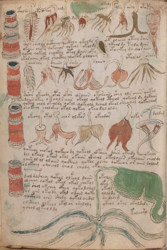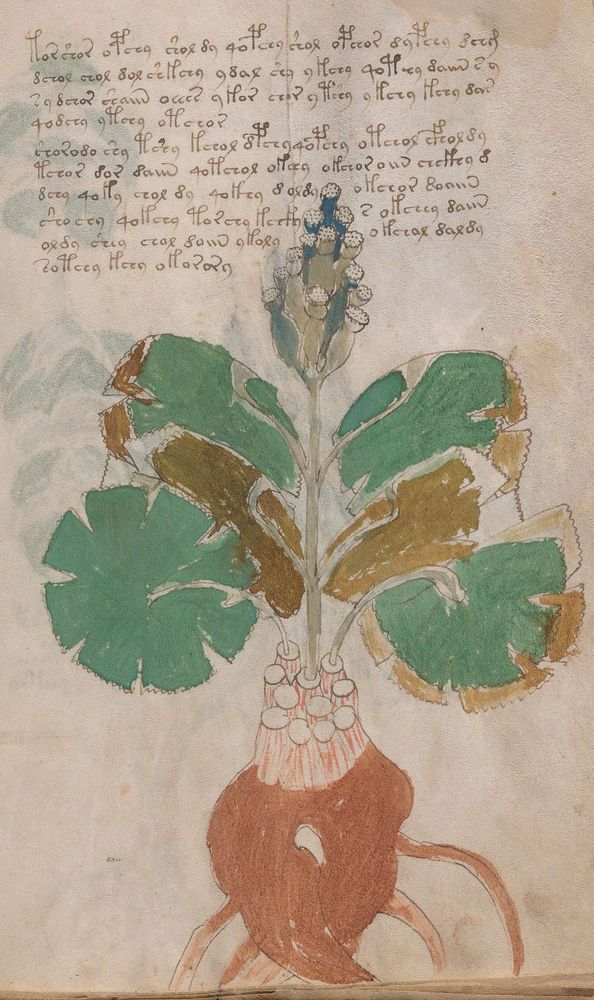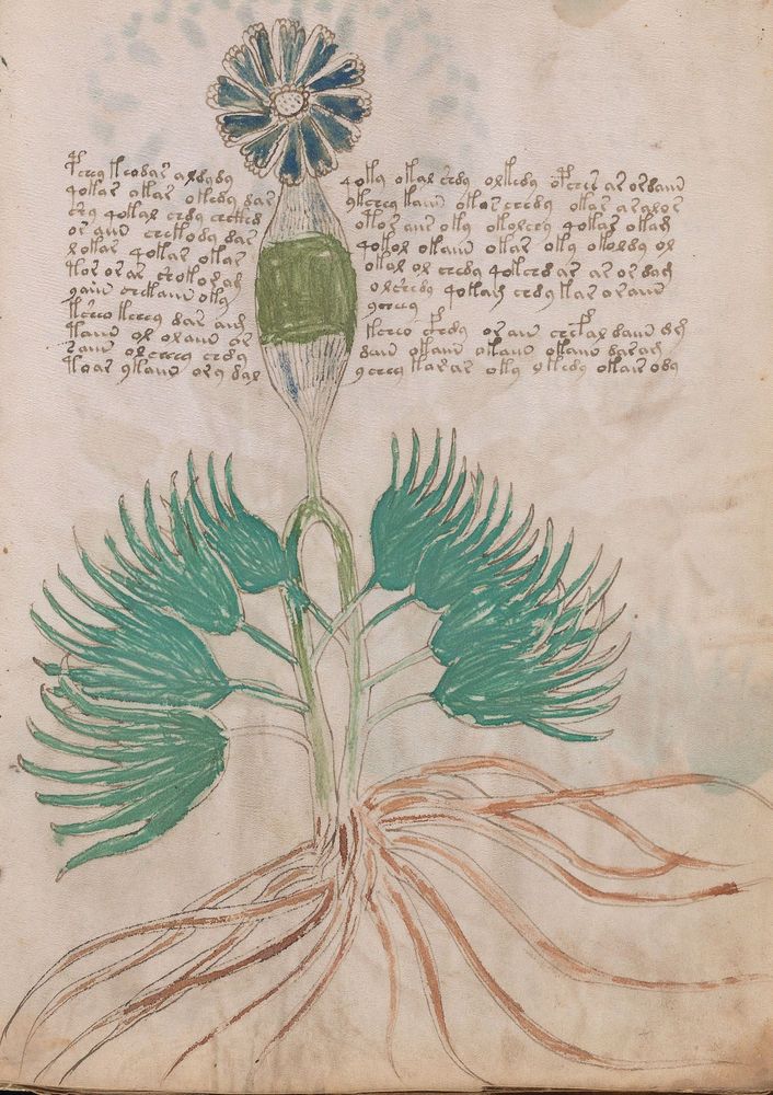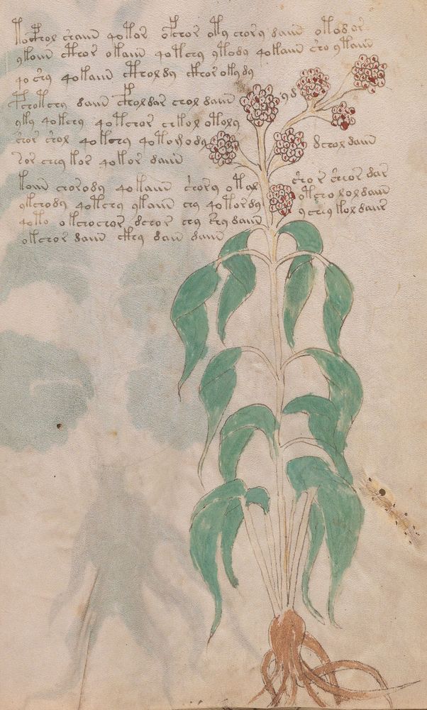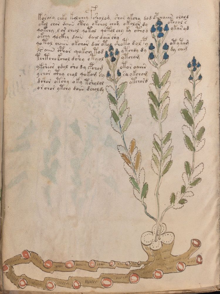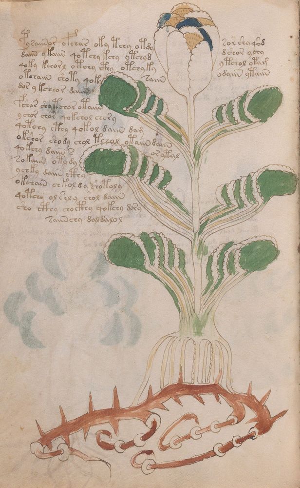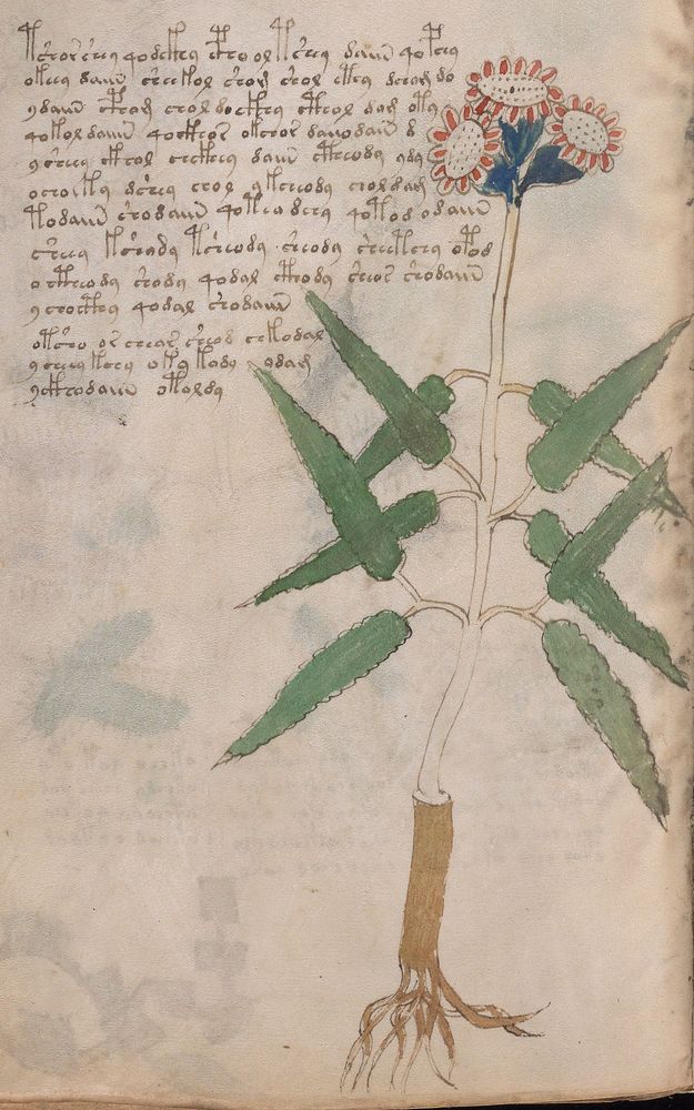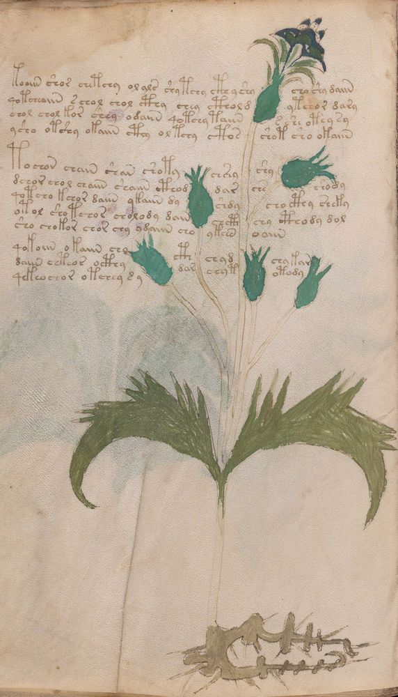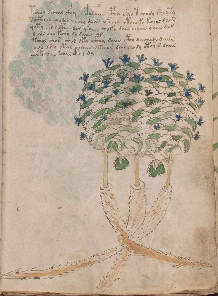 ► Le ms., qui est passé entre les mains de Dee, Rodolph II et Kircher, présente des illustrations de plantes, dont une bonne part son inconnues ainsi que des figurations astrologiques, cosmologiques et vraisemblablement alchimiques voir magiques. Certains chercheurs ont proposé que les deux derniers chapitres pourraient se référer à de la biologie ou de la balnéothérapie ainsi qu’a des recettes phytothérapiques sinon de cuisine…
