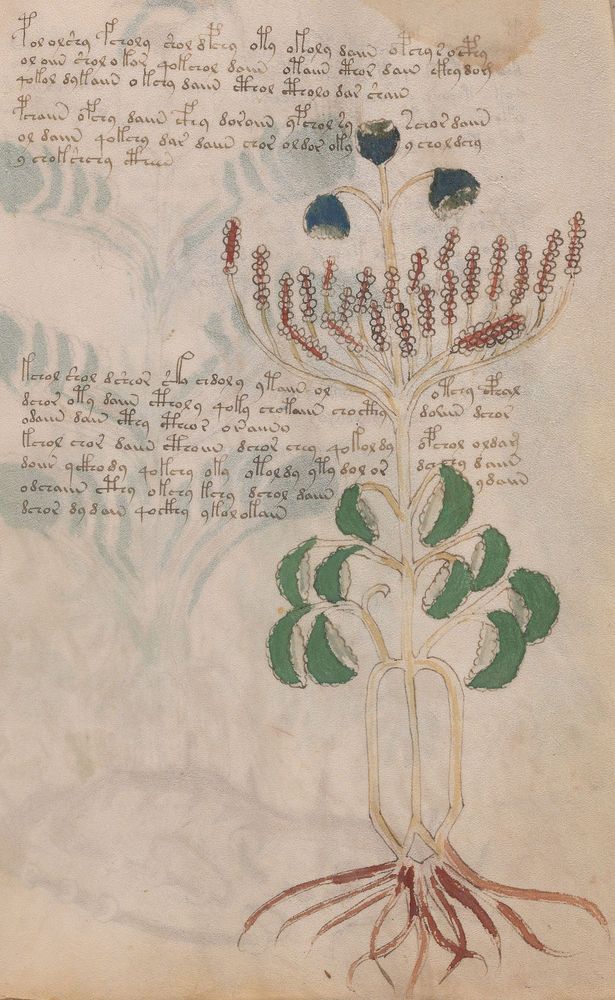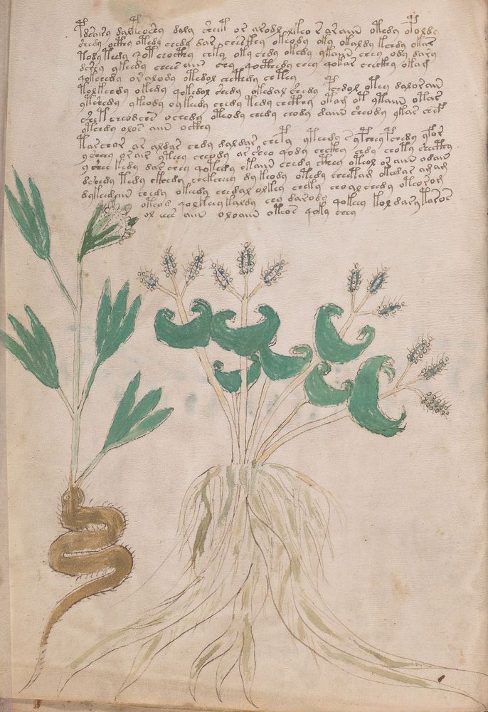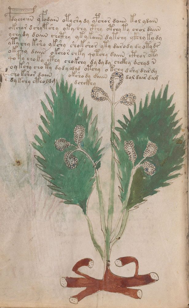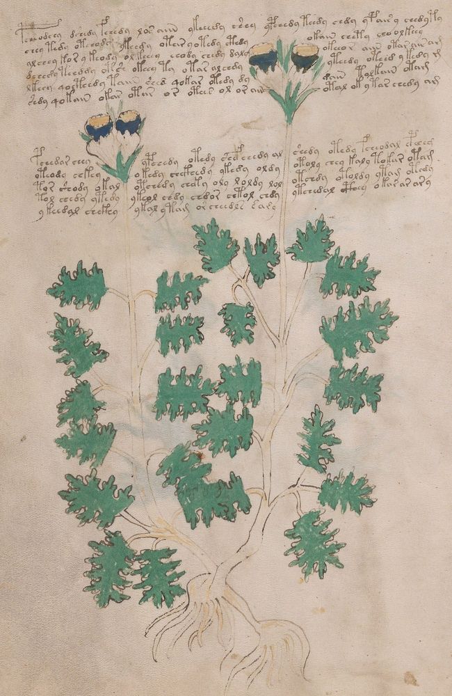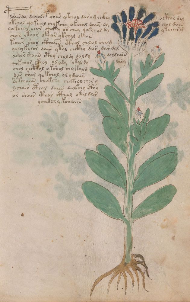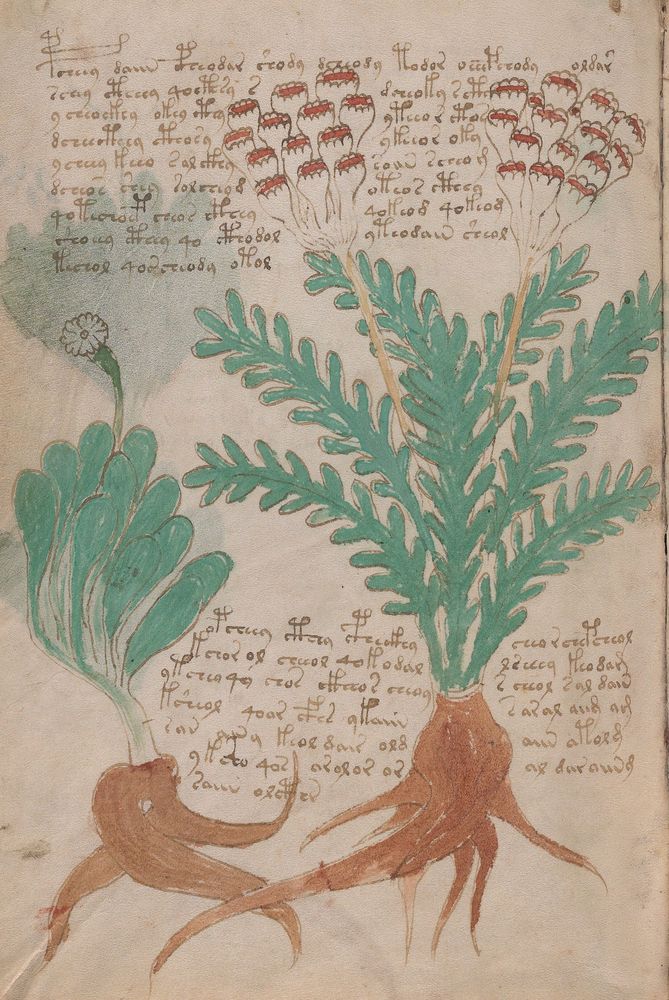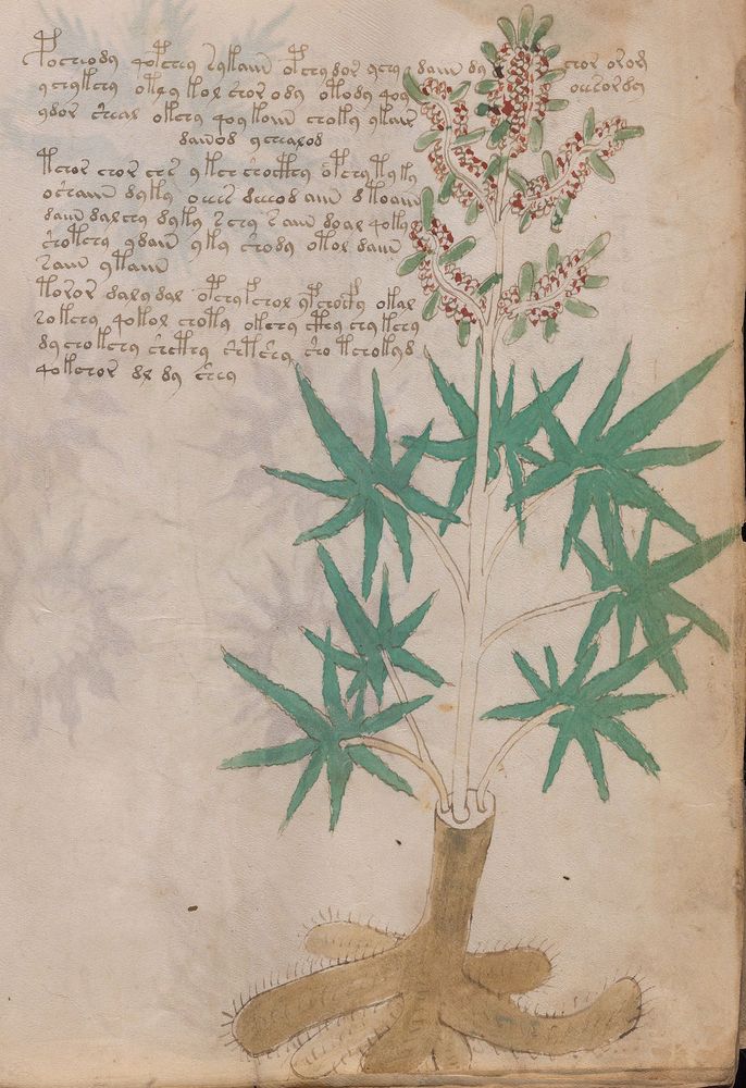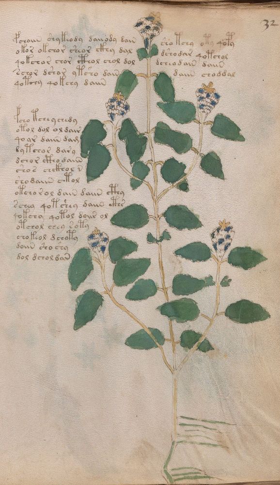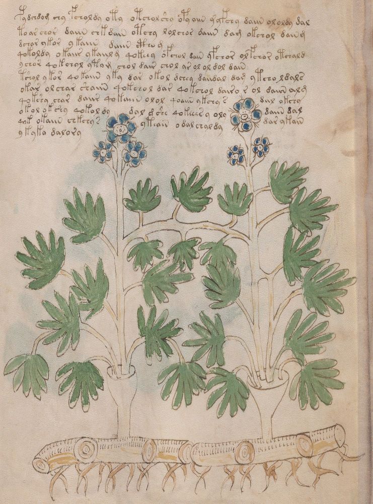 ► Le ms., qui est passé entre les mains de Dee, Rodolph II et Kircher, présente des illustrations de plantes, dont une bonne part son inconnues ainsi que des figurations astrologiques, cosmologiques et vraisemblablement alchimiques voir magiques. Certains chercheurs ont proposé que les deux derniers chapitres pourraient se référer à de la biologie ou de la balnéothérapie ainsi qu’a des recettes phytothérapiques sinon de cuisine…