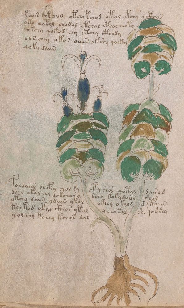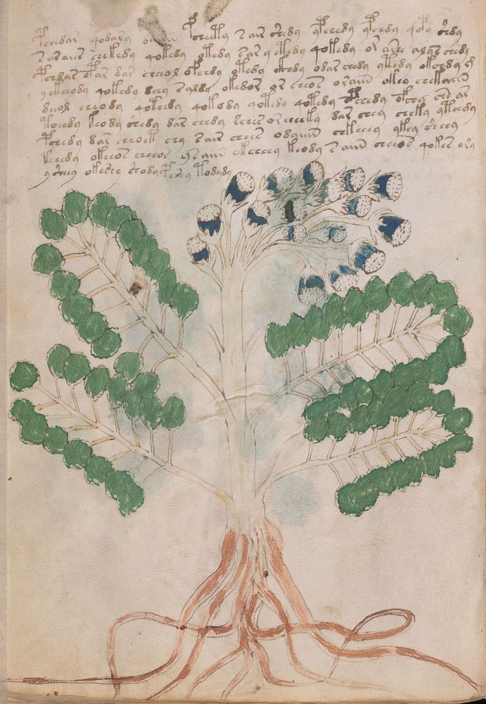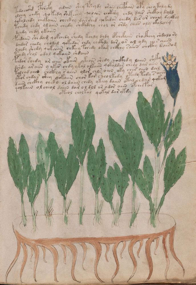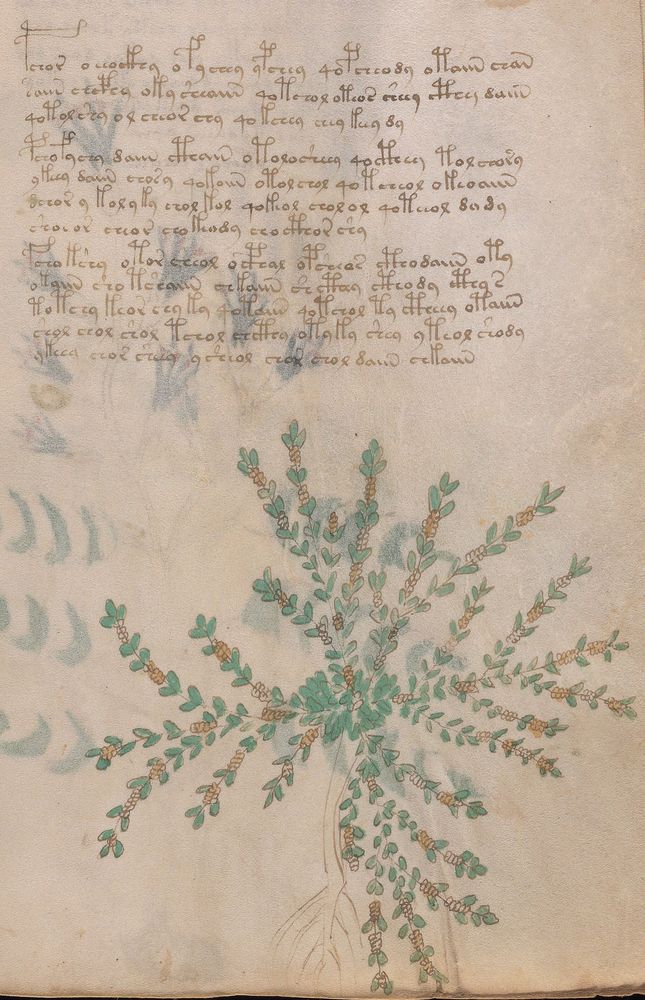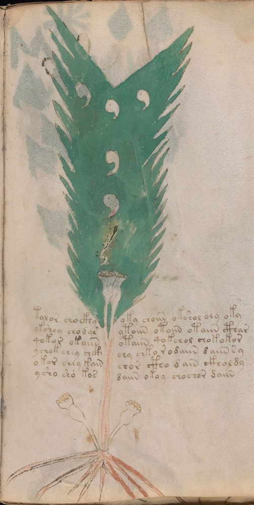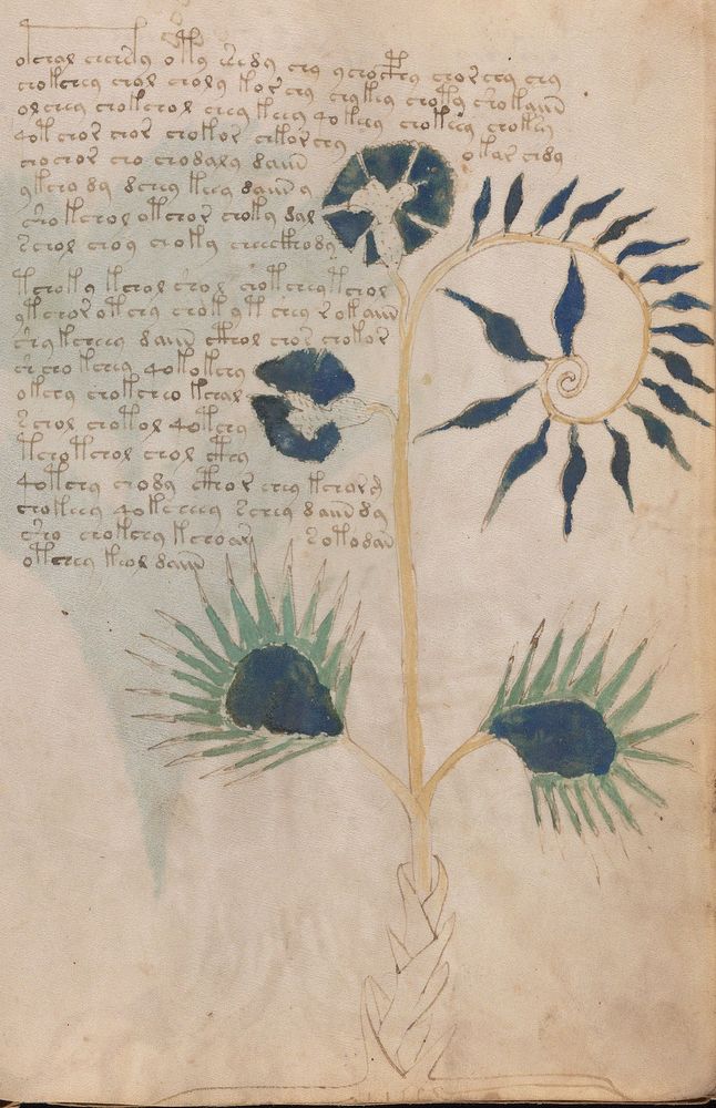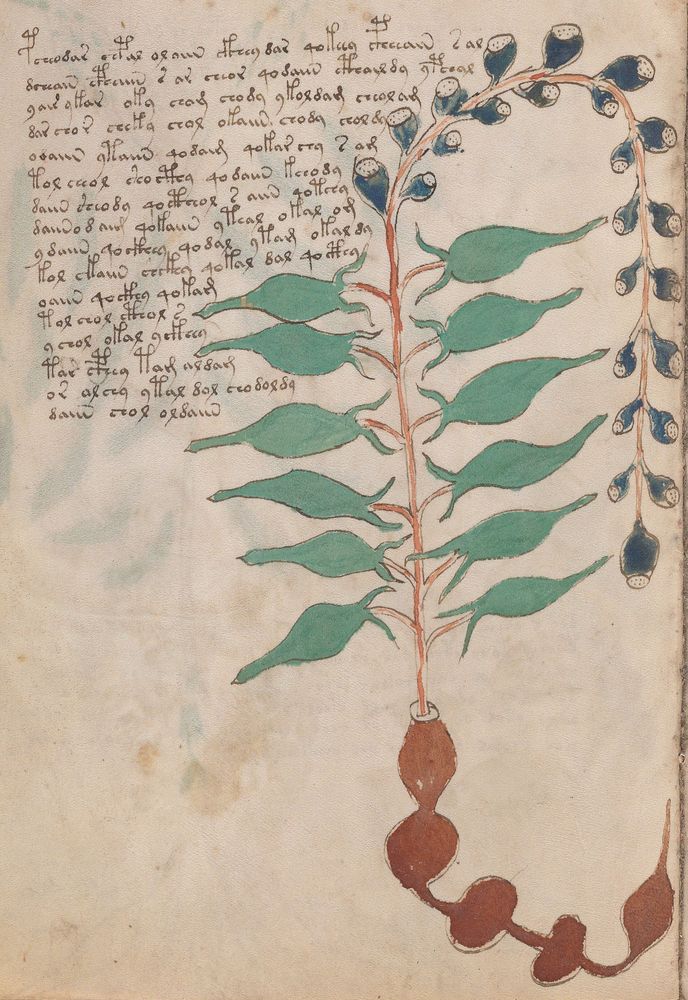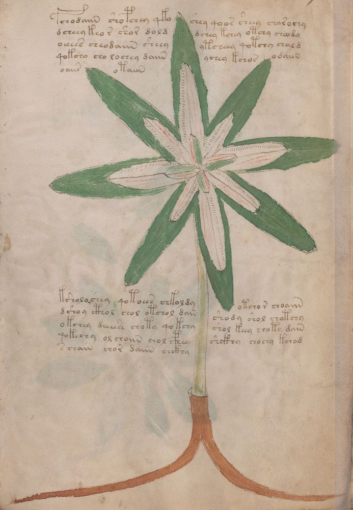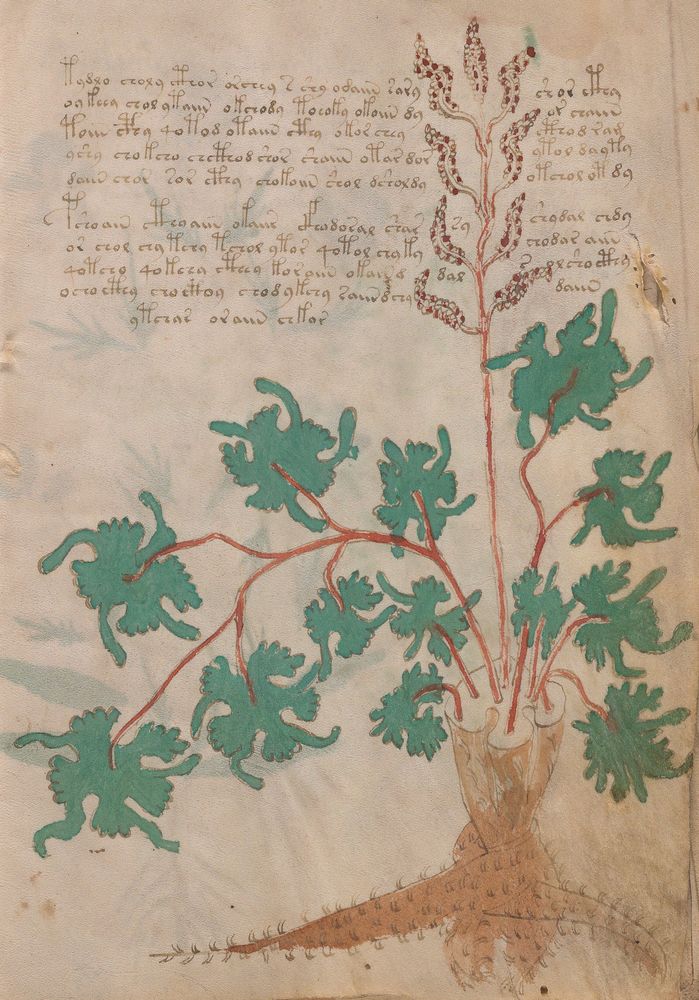 ► Le ms., qui est passé entre les mains de Dee, Rodolph II et Kircher, présente des illustrations de plantes, dont une bonne part son inconnues ainsi que des figurations astrologiques, cosmologiques et vraisemblablement alchimiques voir magiques. Certains chercheurs ont proposé que les deux derniers chapitres pourraient se référer à de la biologie ou de la balnéothérapie ainsi qu’a des recettes phytothérapiques sinon de cuisine…