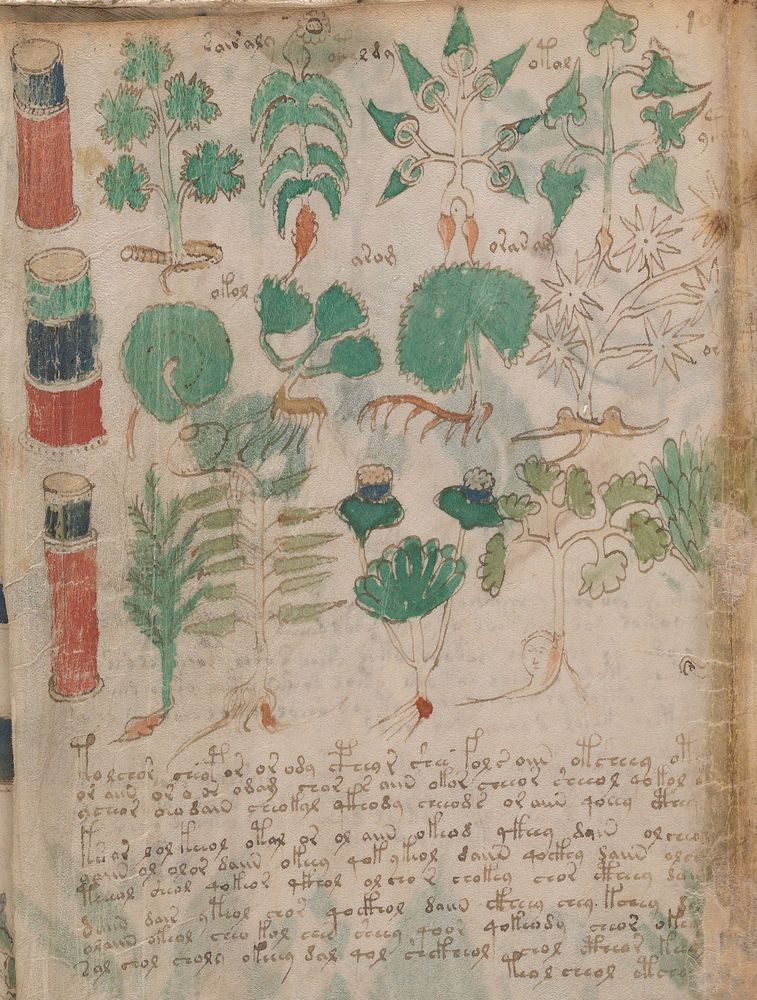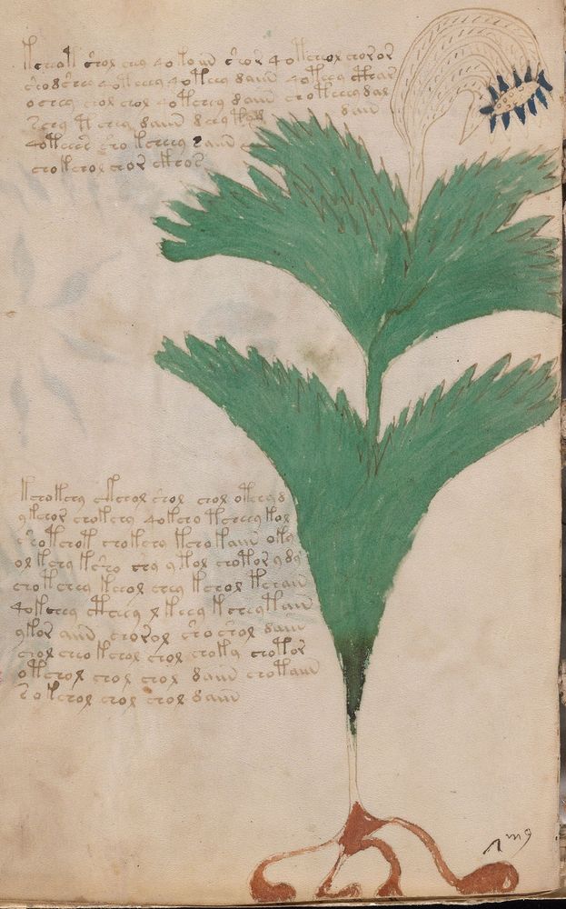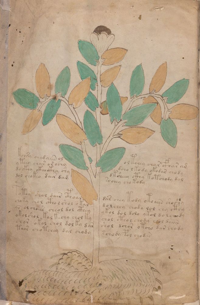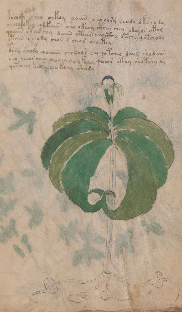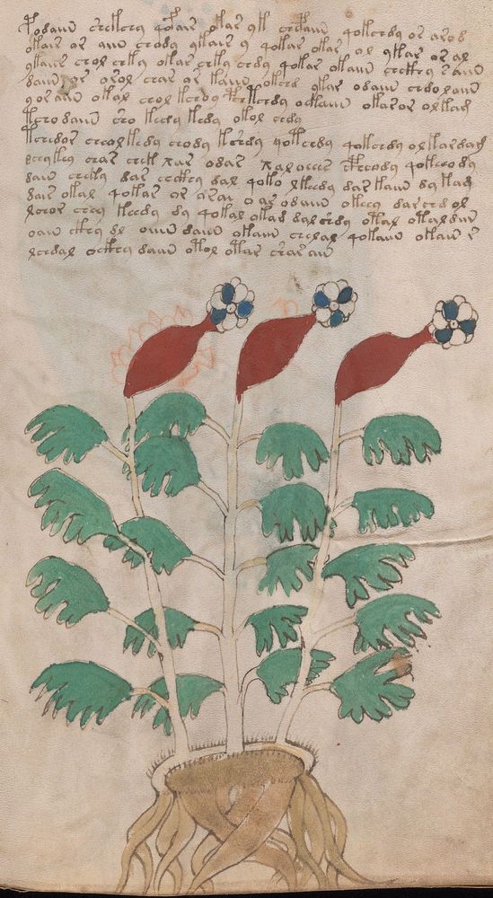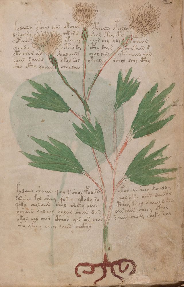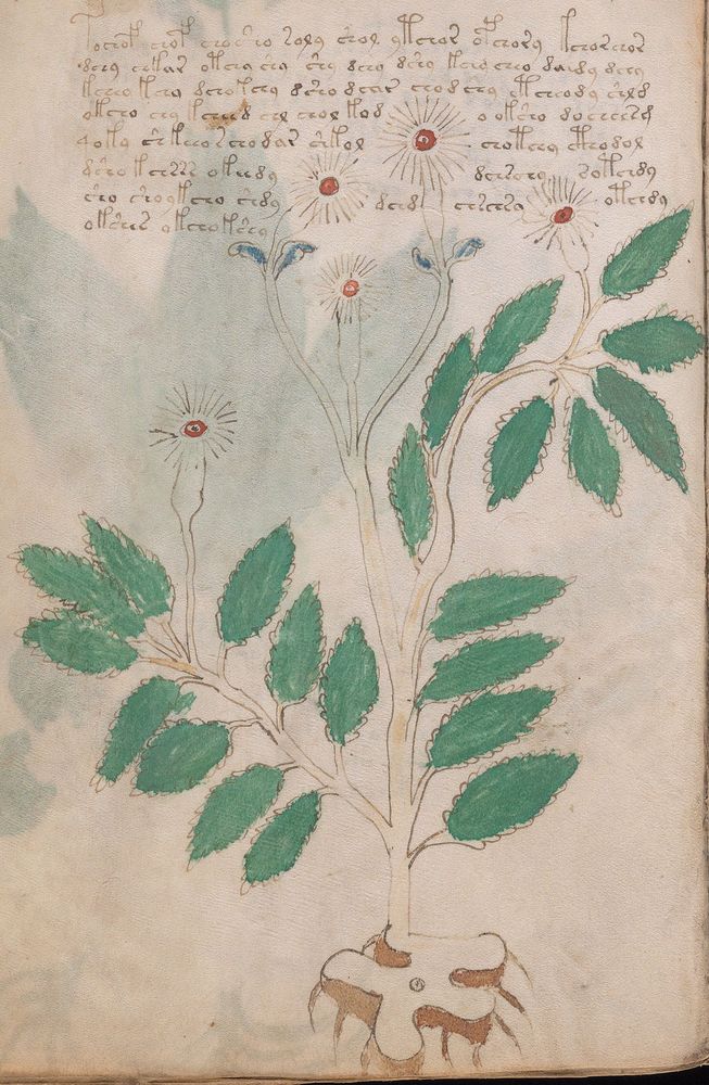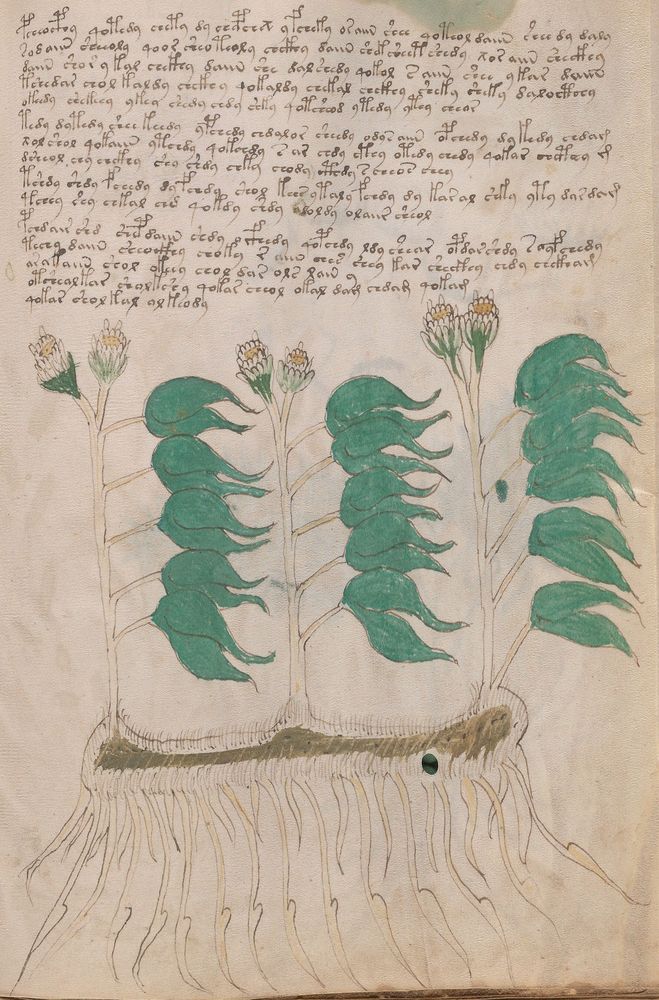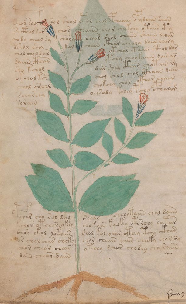► Le ms., qui est passé entre les mains de Dee, Rodolph II et Kircher, présente des illustrations de plantes, dont une bonne part son inconnues ainsi que des figurations astrologiques, cosmologiques et vraisemblablement alchimiques voir magiques. Certains chercheurs ont proposé que les deux derniers chapitres pourraient se référer à de la biologie ou de la balnéothérapie ainsi qu’a des recettes phytothérapiques sinon de cuisine…