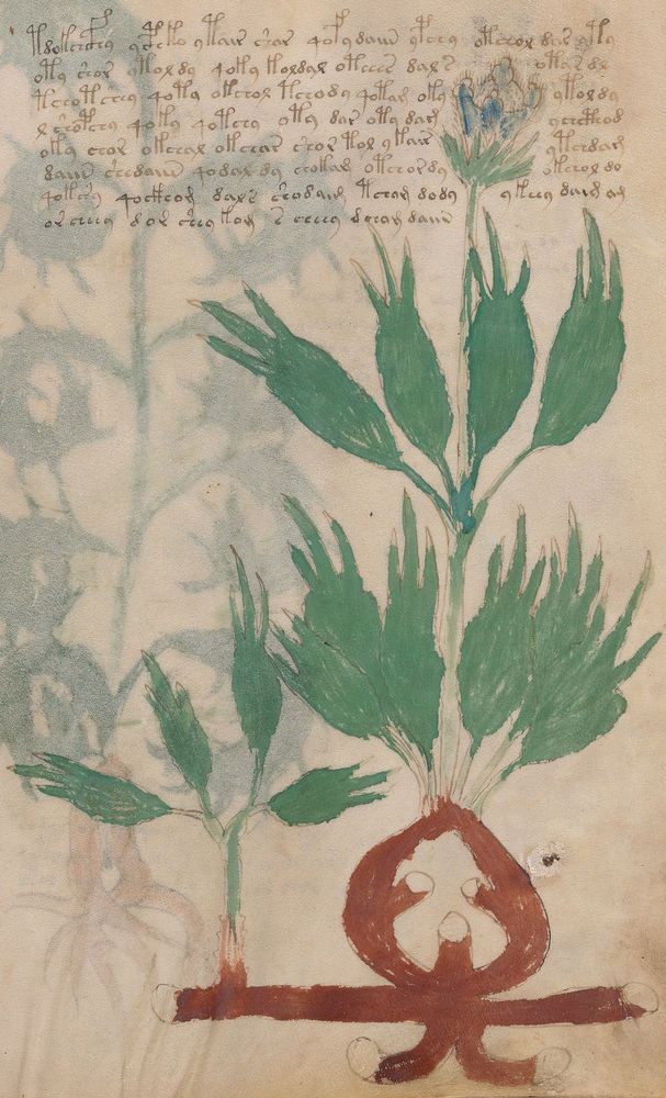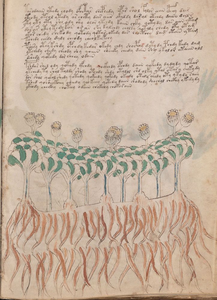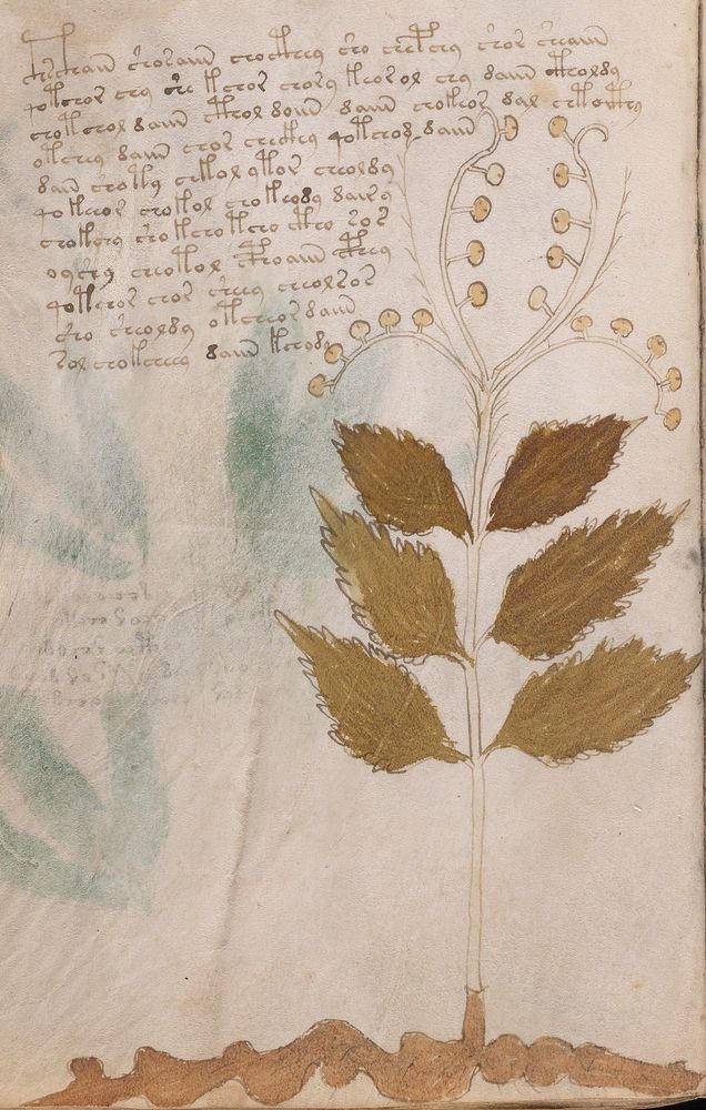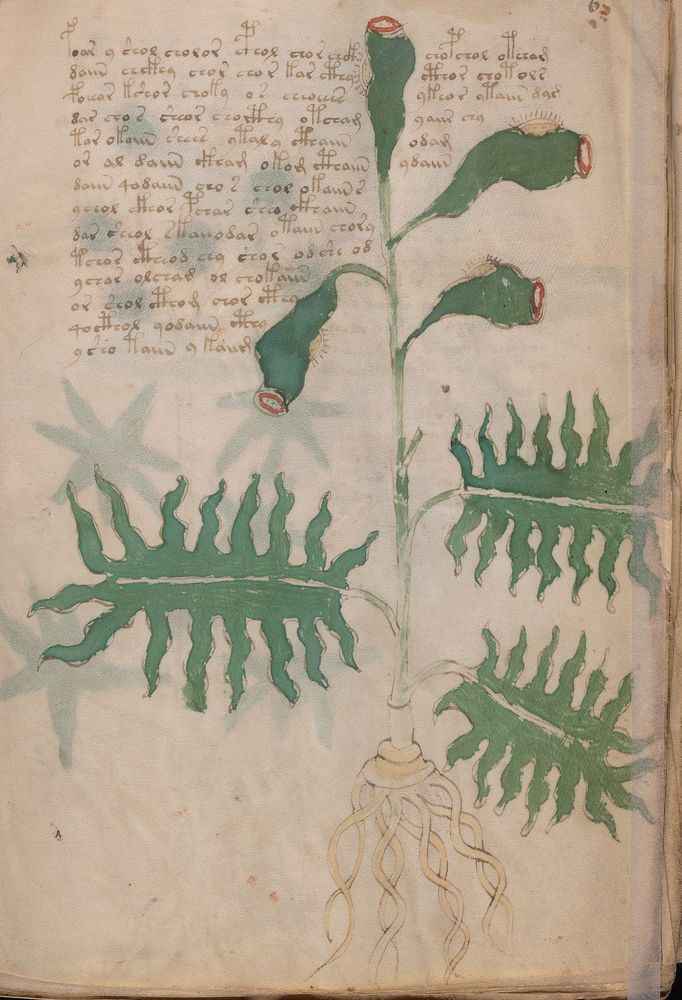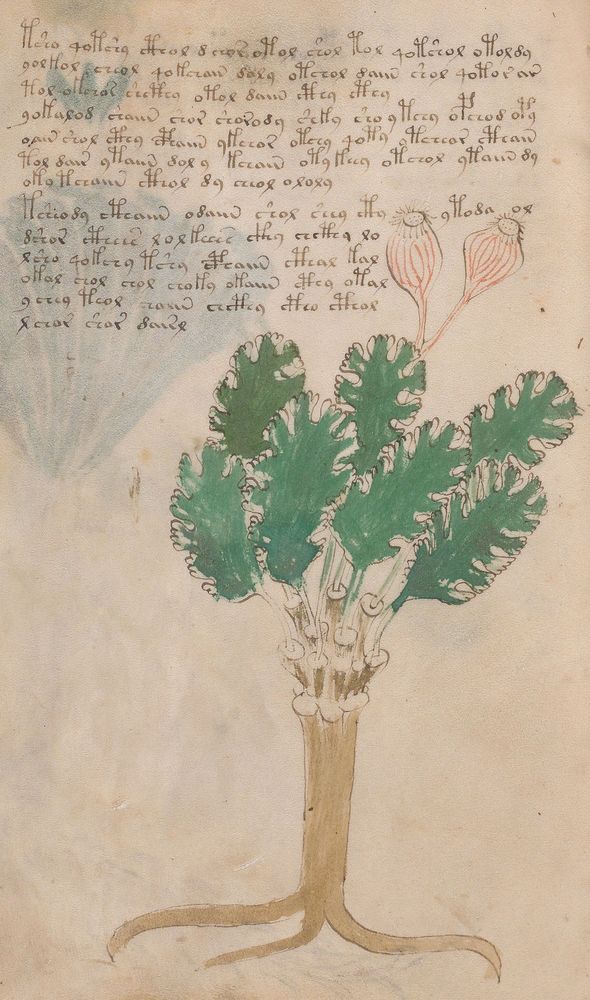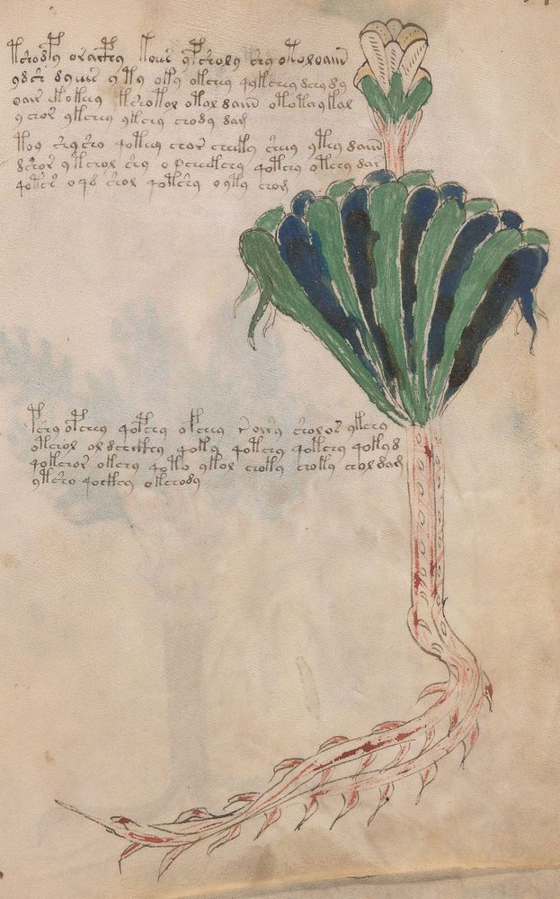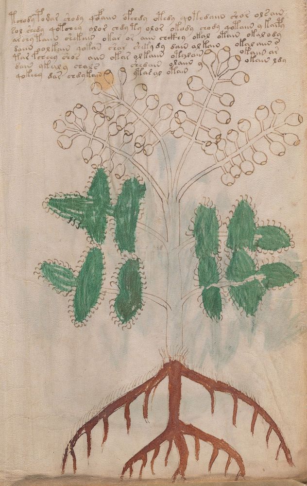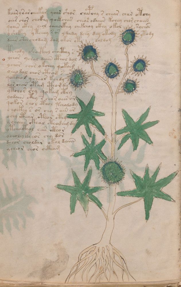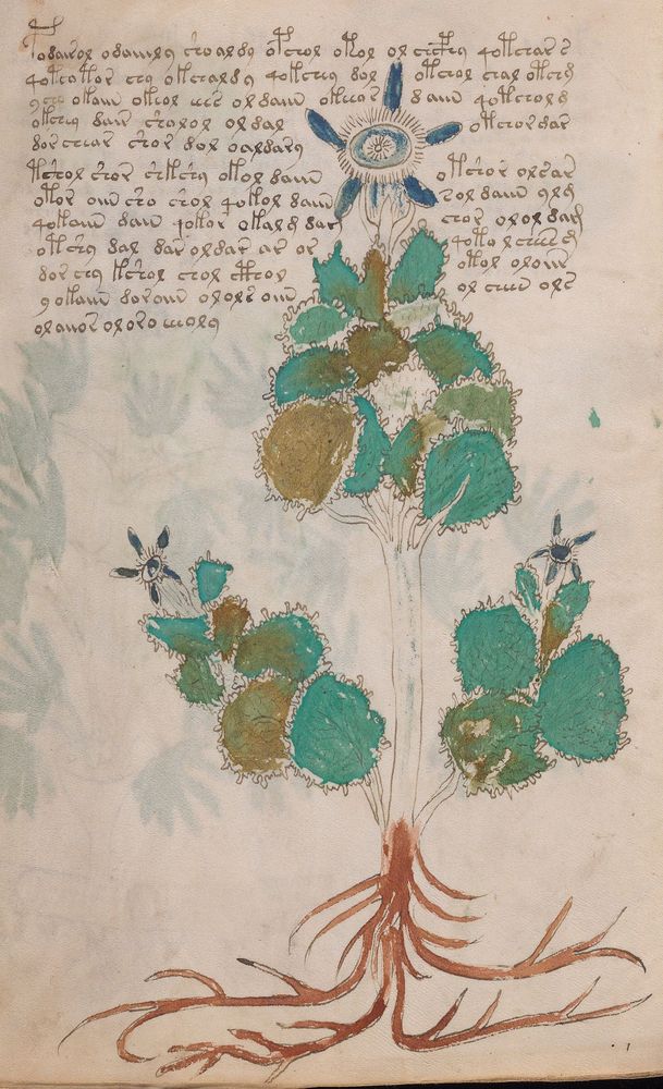 ► Le ms., qui est passé entre les mains de Dee, Rodolph II et Kircher, présente des illustrations de plantes, dont une bonne part son inconnues ainsi que des figurations astrologiques, cosmologiques et vraisemblablement alchimiques voir magiques. Certains chercheurs ont proposé que les deux derniers chapitres pourraient se référer à de la biologie ou de la balnéothérapie ainsi qu’a des recettes phytothérapiques sinon de cuisine…