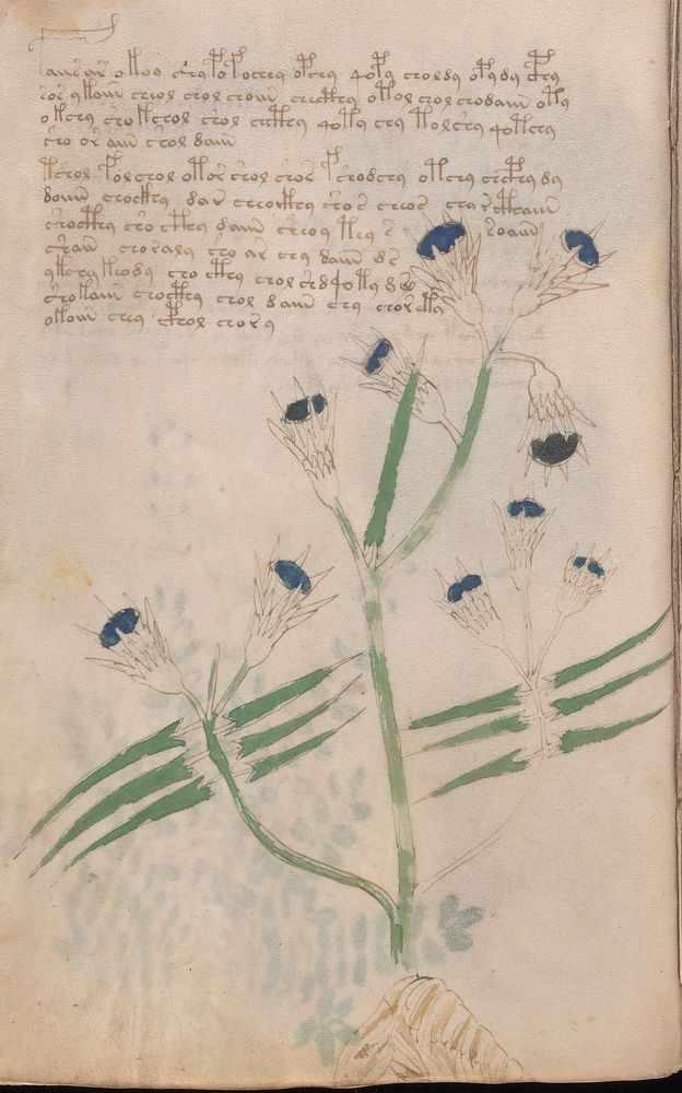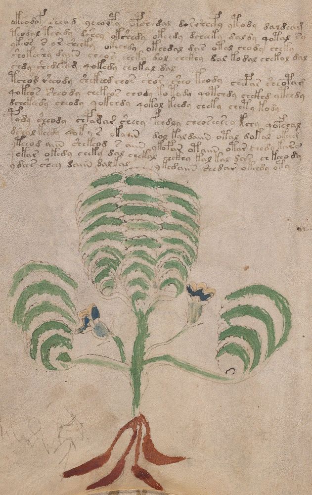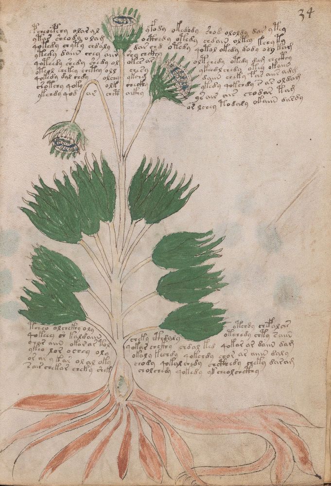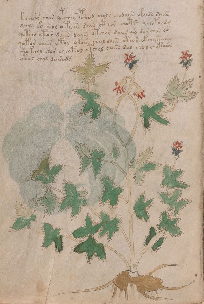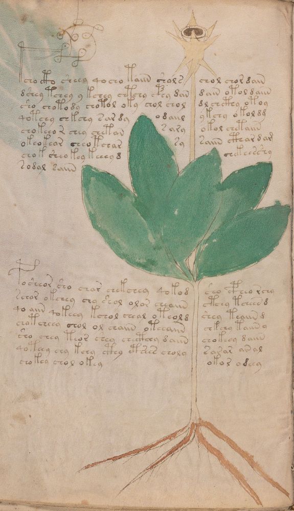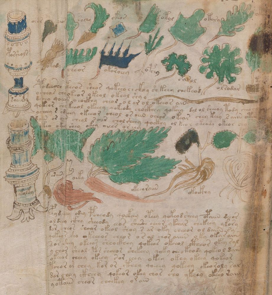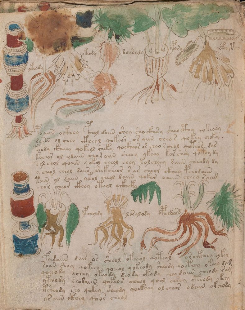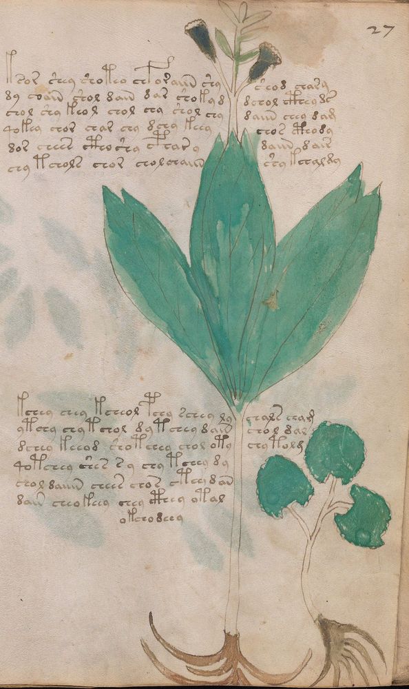 ► Le ms., qui est passé entre les mains de Dee, Rodolph II et Kircher, présente des illustrations de plantes, dont une bonne part son inconnues ainsi que des figurations astrologiques, cosmologiques et vraisemblablement alchimiques voir magiques. Certains chercheurs ont proposé que les deux derniers chapitres pourraient se référer à de la biologie ou de la balnéothérapie ainsi qu’a des recettes phytothérapiques sinon de cuisine…