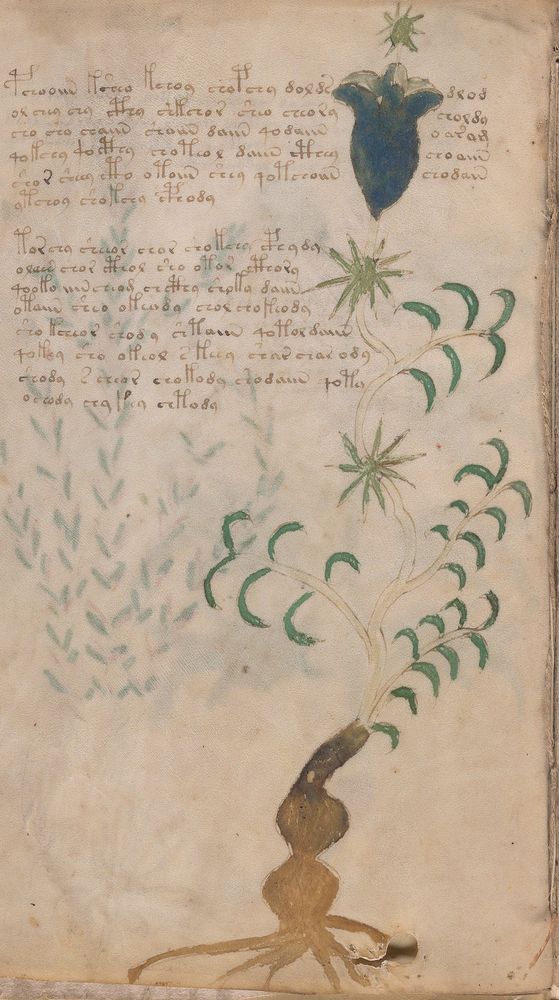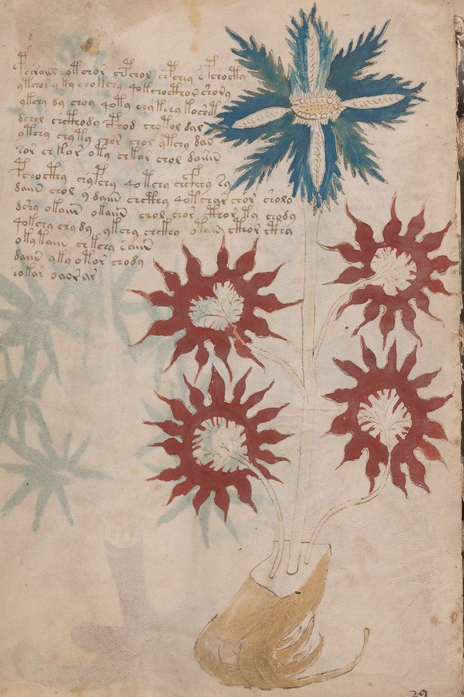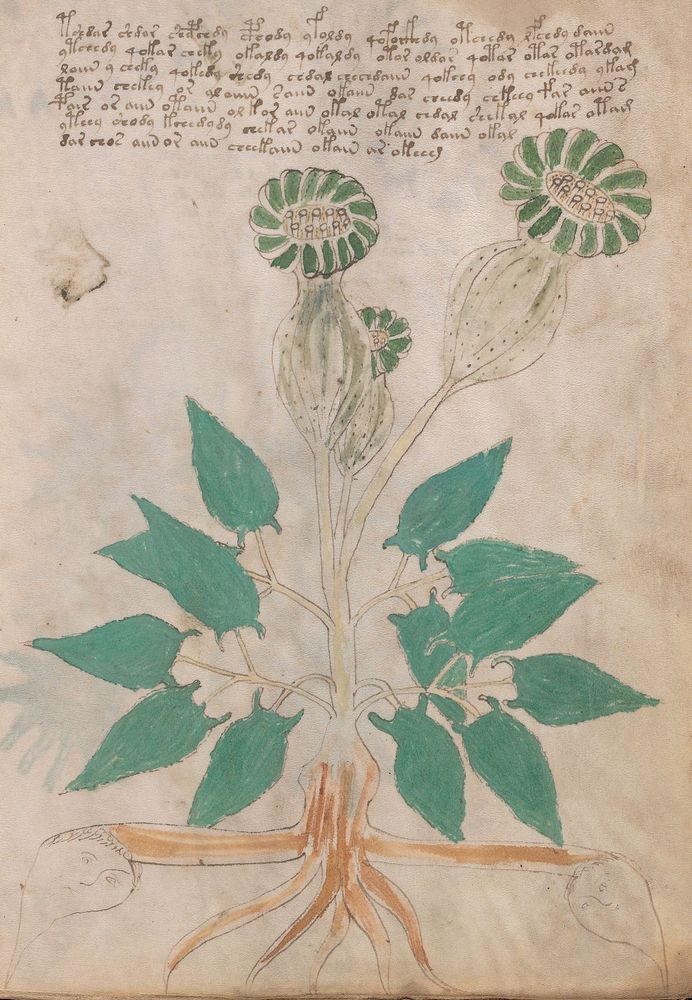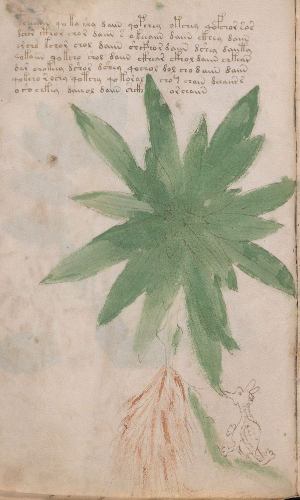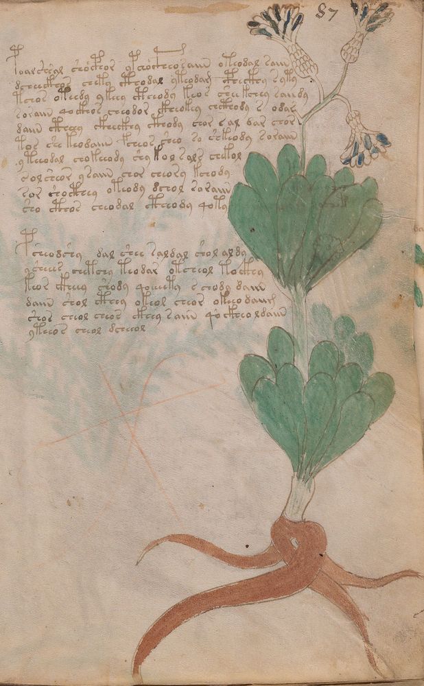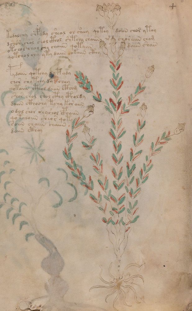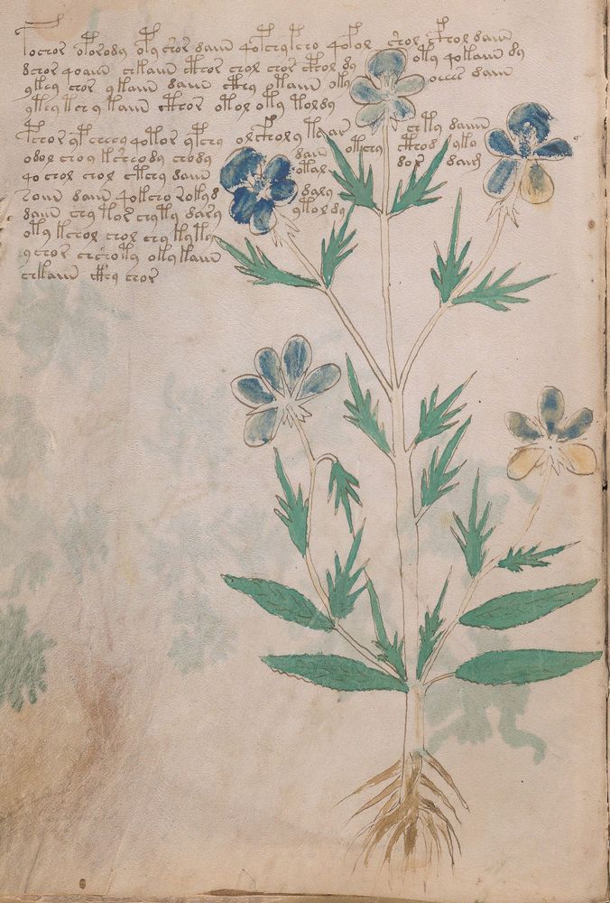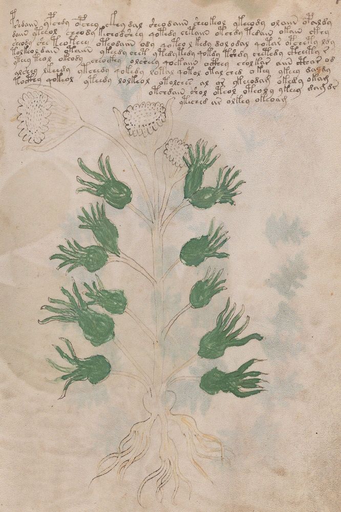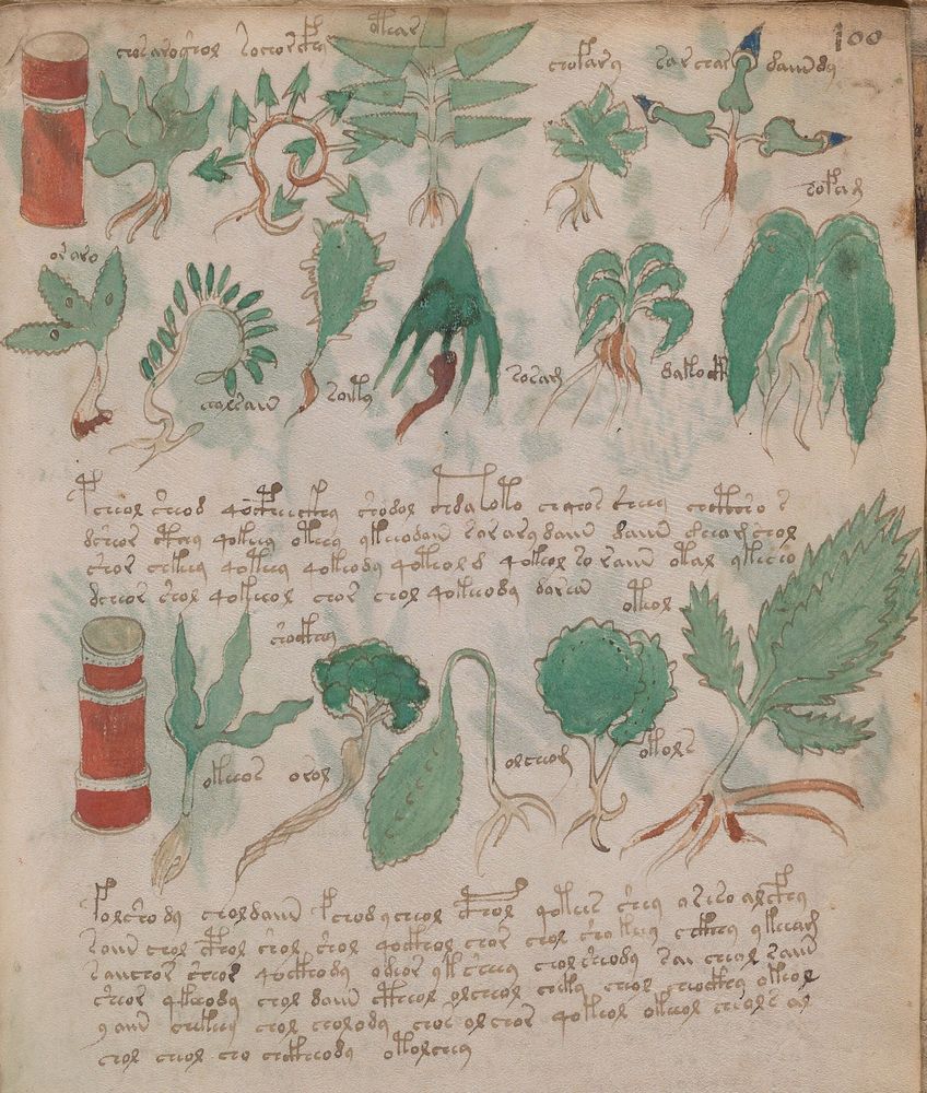 ► Le ms., qui est passé entre les mains de Dee, Rodolph II et Kircher, présente des illustrations de plantes, dont une bonne part son inconnues ainsi que des figurations astrologiques, cosmologiques et vraisemblablement alchimiques voir magiques. Certains chercheurs ont proposé que les deux derniers chapitres pourraient se référer à de la biologie ou de la balnéothérapie ainsi qu’a des recettes phytothérapiques sinon de cuisine…