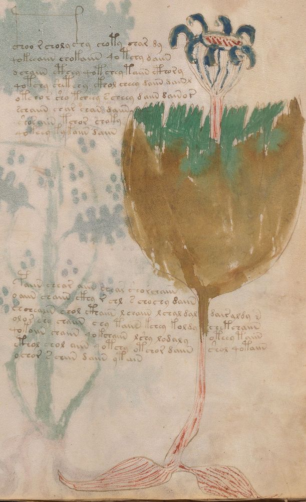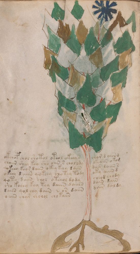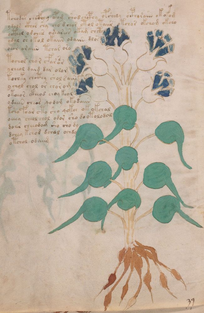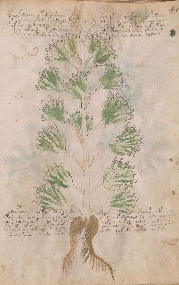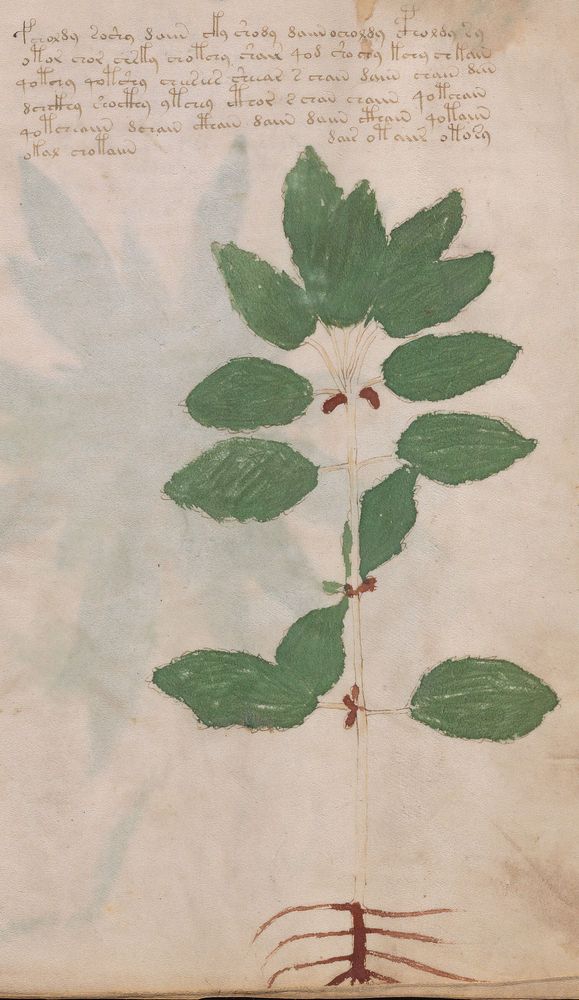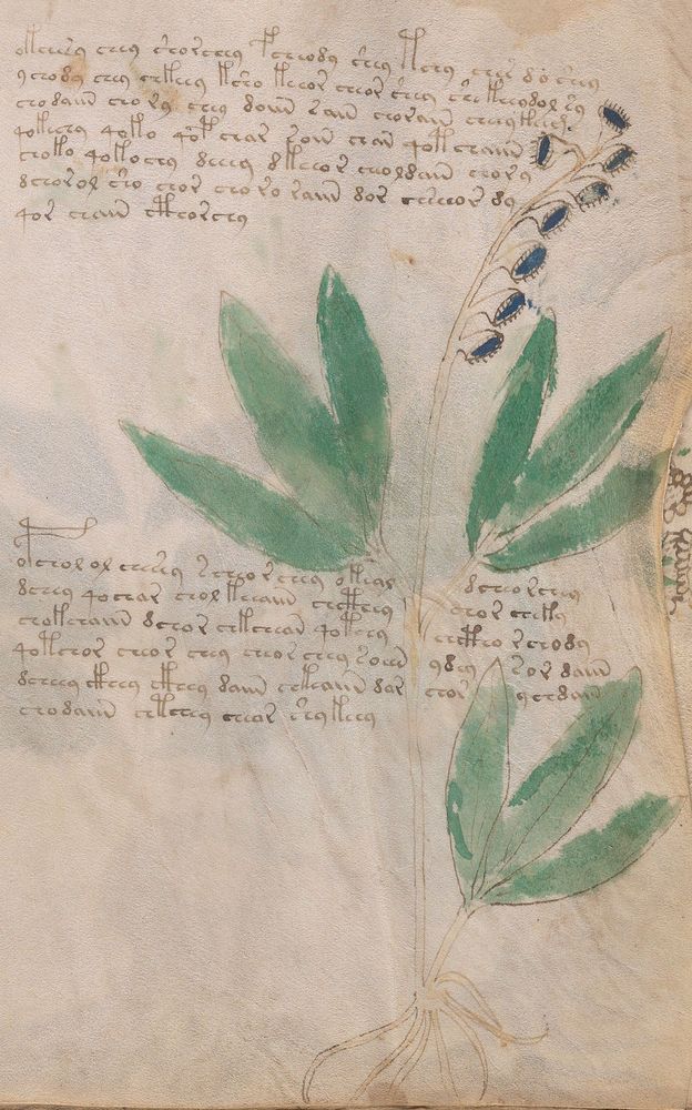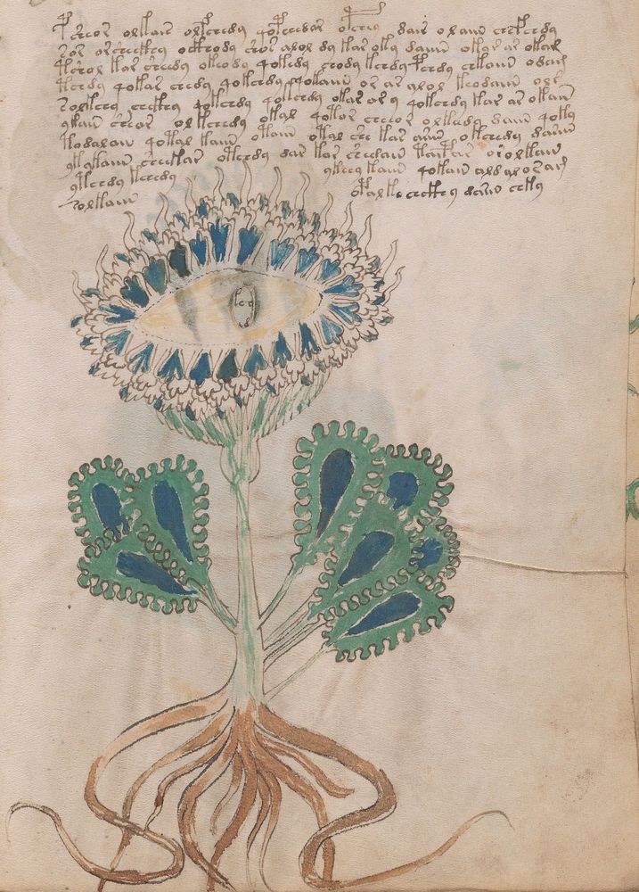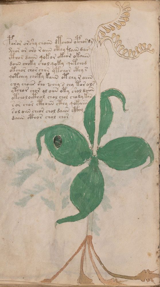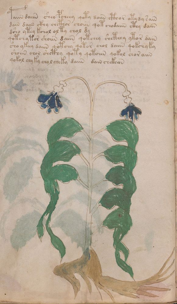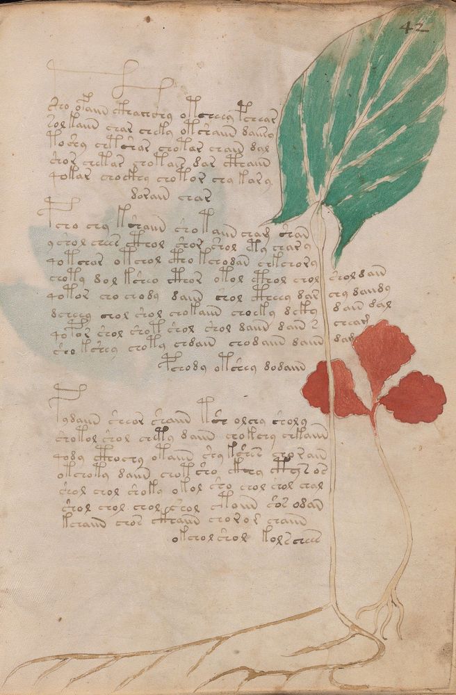 ► Le ms., qui est passé entre les mains de Dee, Rodolph II et Kircher, présente des illustrations de plantes, dont une bonne part son inconnues ainsi que des figurations astrologiques, cosmologiques et vraisemblablement alchimiques voir magiques. Certains chercheurs ont proposé que les deux derniers chapitres pourraient se référer à de la biologie ou de la balnéothérapie ainsi qu’a des recettes phytothérapiques sinon de cuisine…