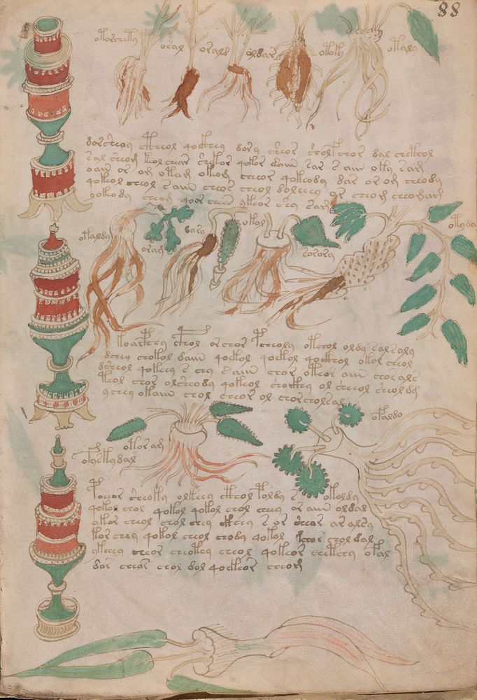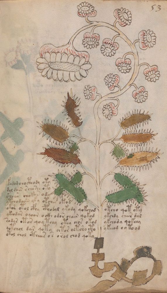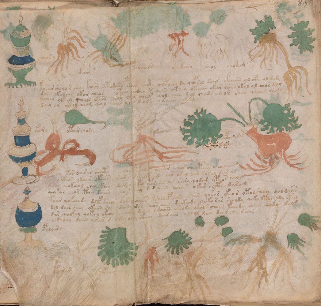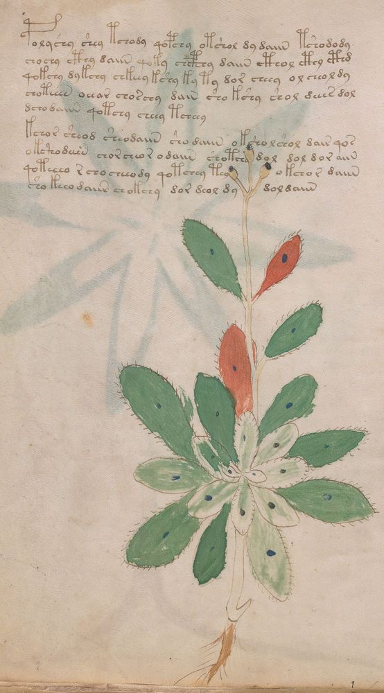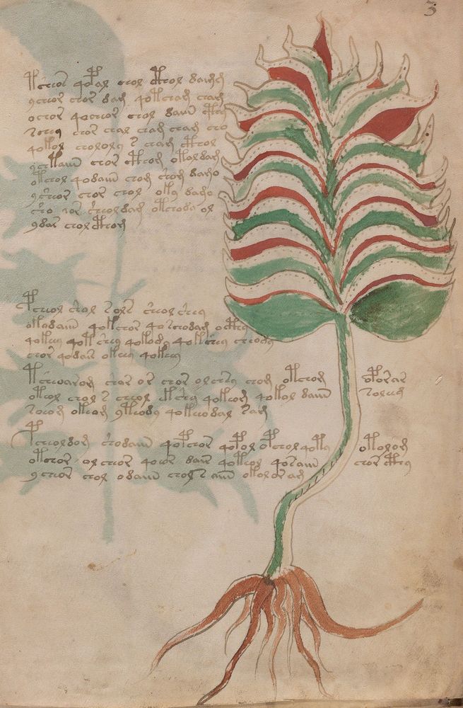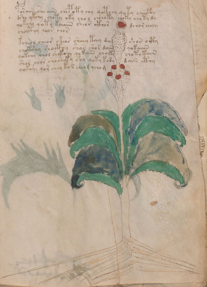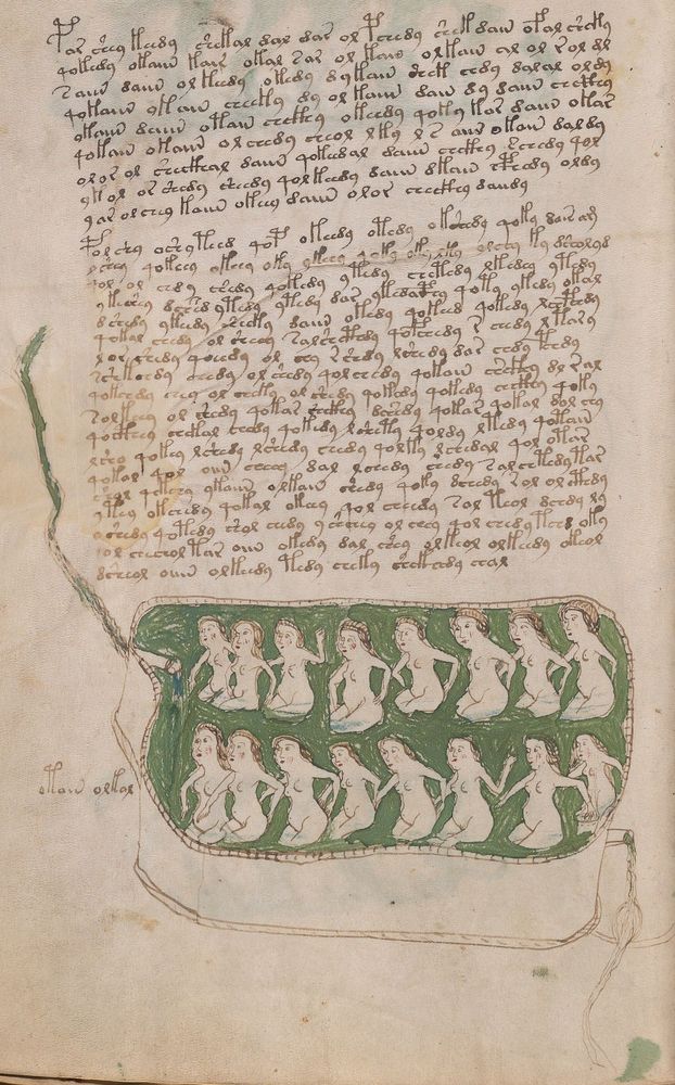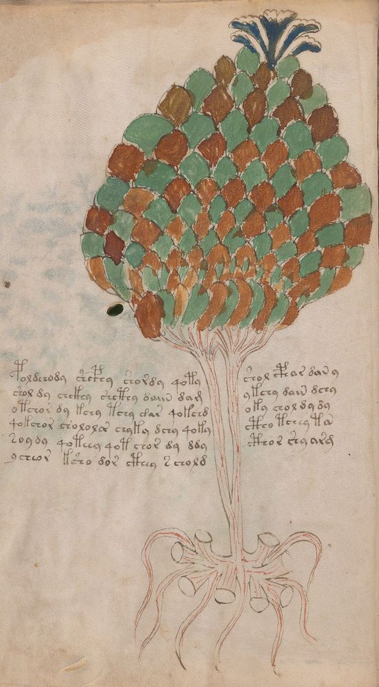 ► Le ms., qui est passé entre les mains de Dee, Rodolph II et Kircher, présente des illustrations de plantes, dont une bonne part son inconnues ainsi que des figurations astrologiques, cosmologiques et vraisemblablement alchimiques voir magiques. Certains chercheurs ont proposé que les deux derniers chapitres pourraient se référer à de la biologie ou de la balnéothérapie ainsi qu’a des recettes phytothérapiques sinon de cuisine…