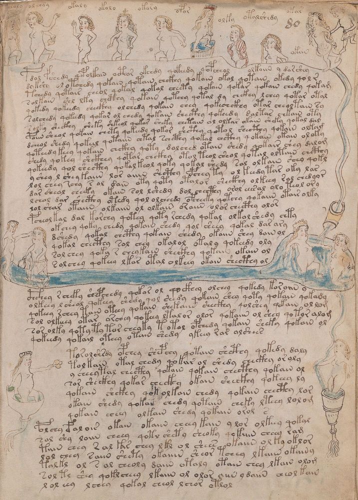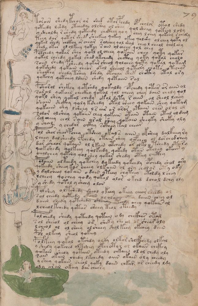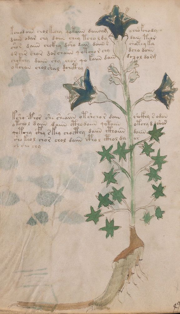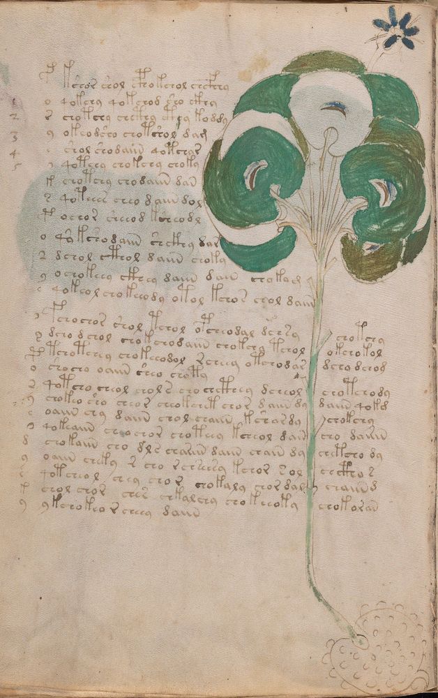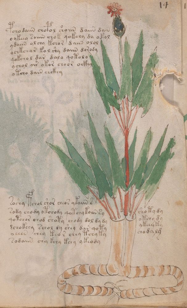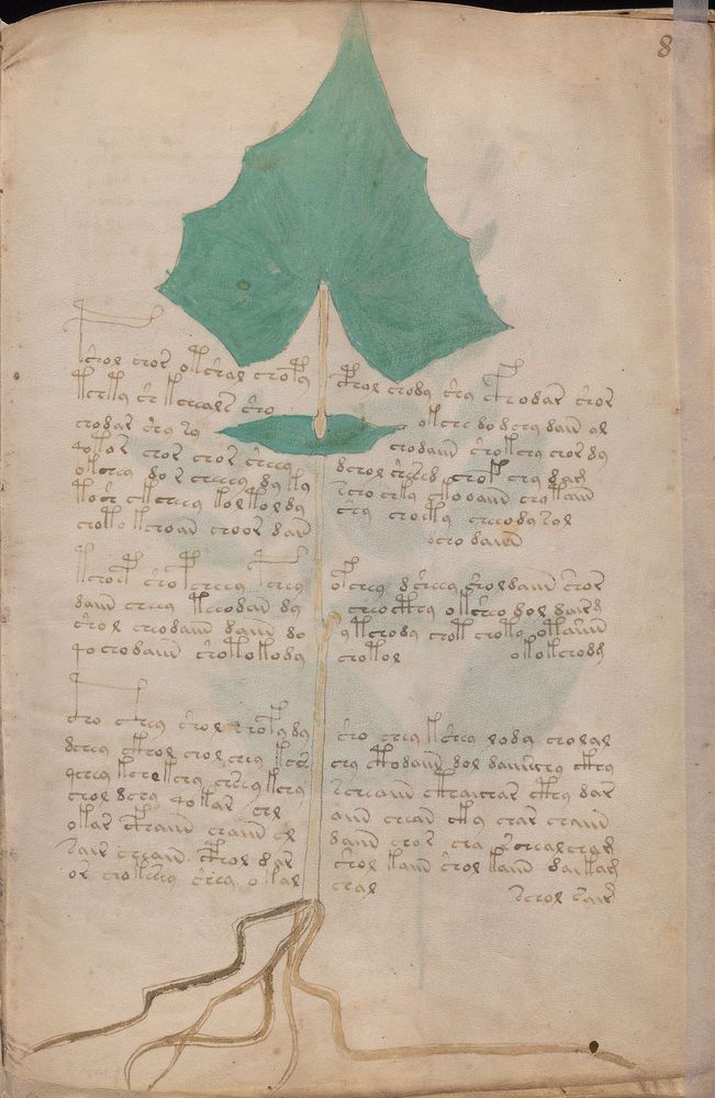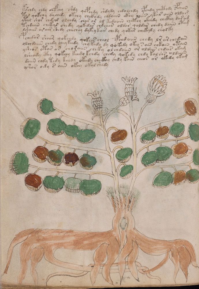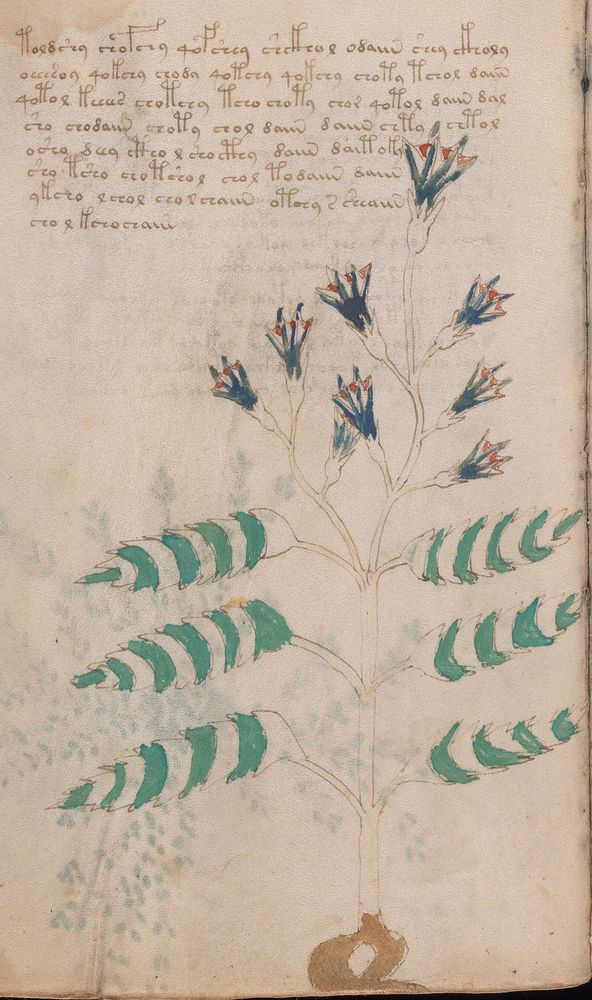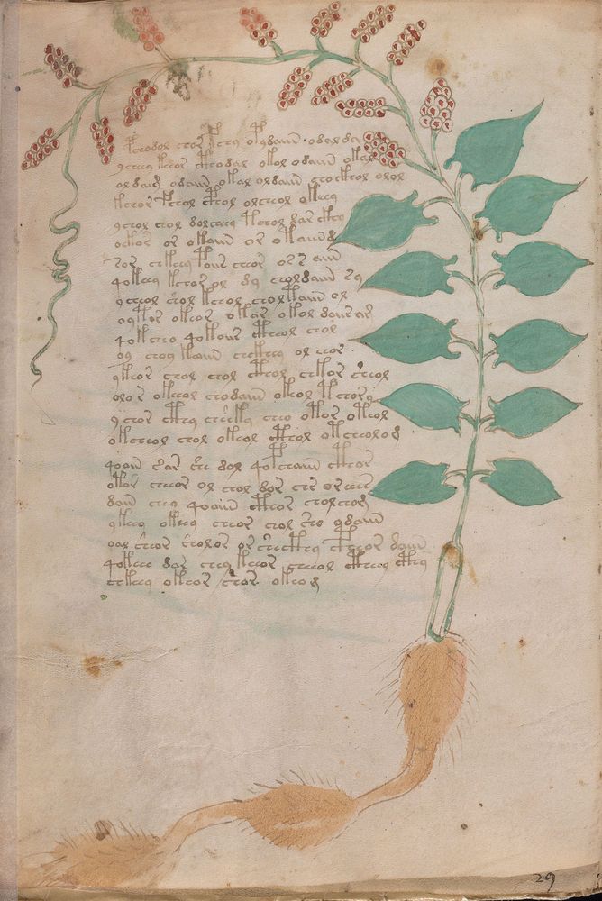 ► Le ms., qui est passé entre les mains de Dee, Rodolph II et Kircher, présente des illustrations de plantes, dont une bonne part son inconnues ainsi que des figurations astrologiques, cosmologiques et vraisemblablement alchimiques voir magiques. Certains chercheurs ont proposé que les deux derniers chapitres pourraient se référer à de la biologie ou de la balnéothérapie ainsi qu’a des recettes phytothérapiques sinon de cuisine…