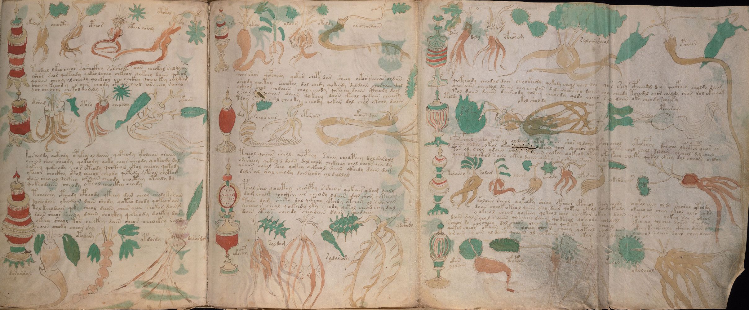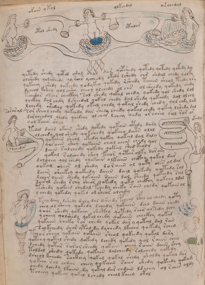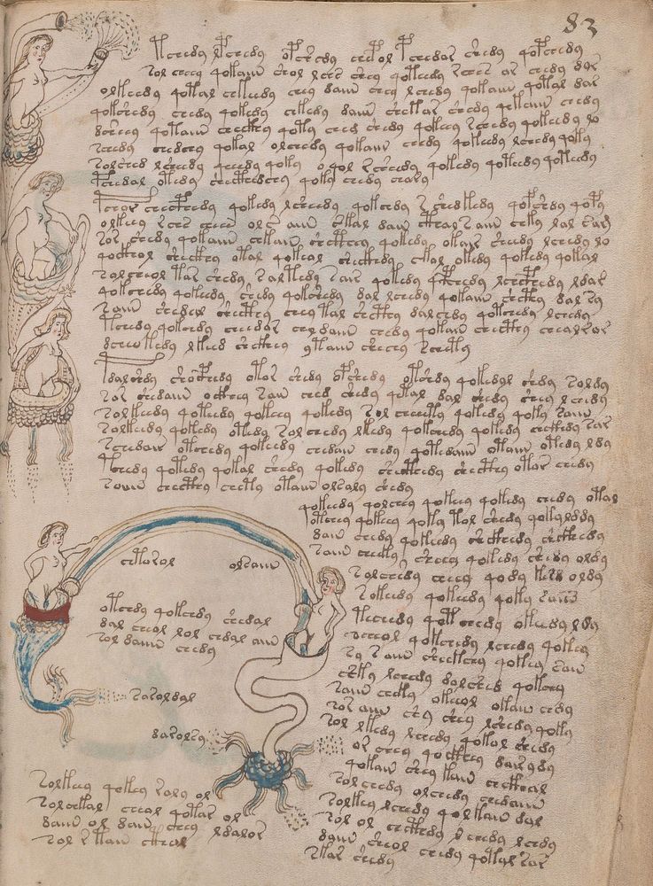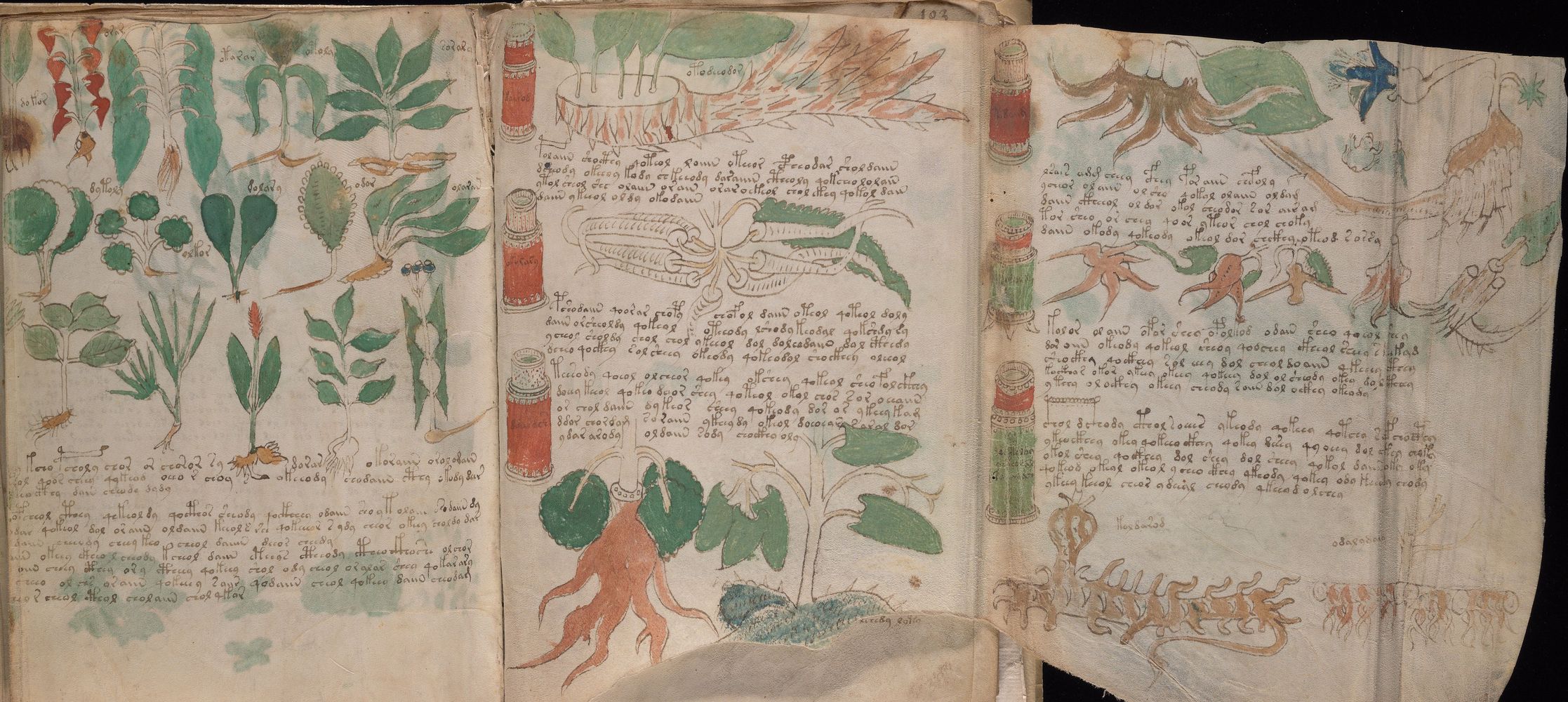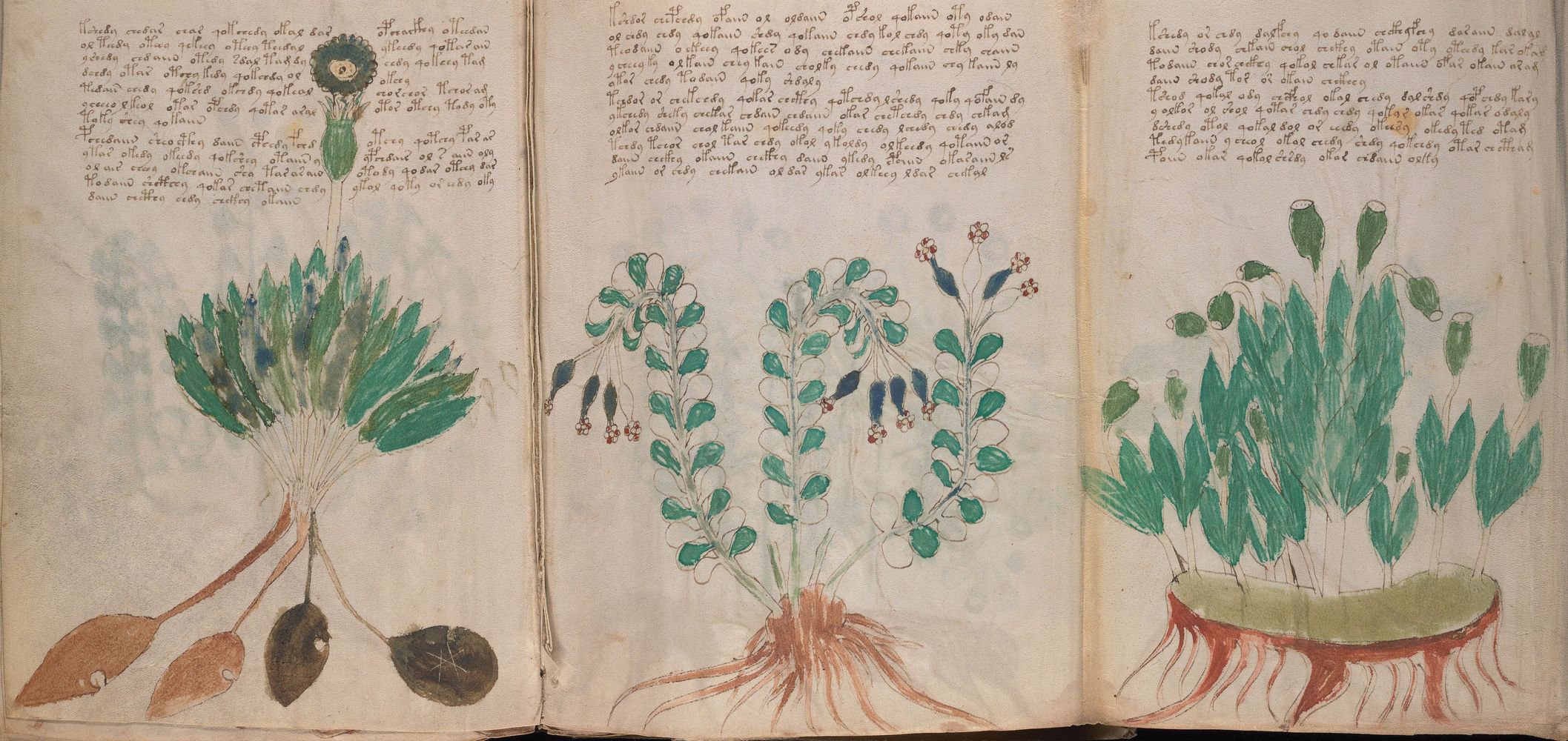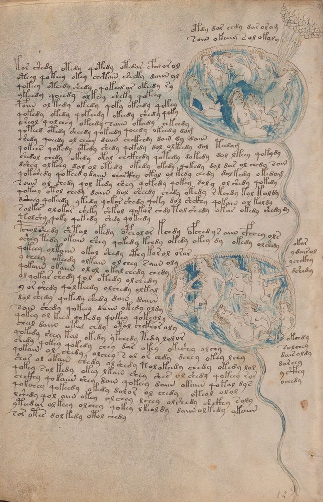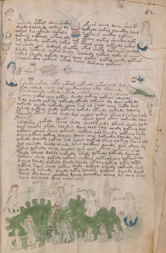 ► Le ms., qui est passé entre les mains de Dee, Rodolph II et Kircher, présente des illustrations de plantes, dont une bonne part son inconnues ainsi que des figurations astrologiques, cosmologiques et vraisemblablement alchimiques voir magiques. Certains chercheurs ont proposé que les deux derniers chapitres pourraient se référer à de la biologie ou de la balnéothérapie ainsi qu’a des recettes phytothérapiques sinon de cuisine…