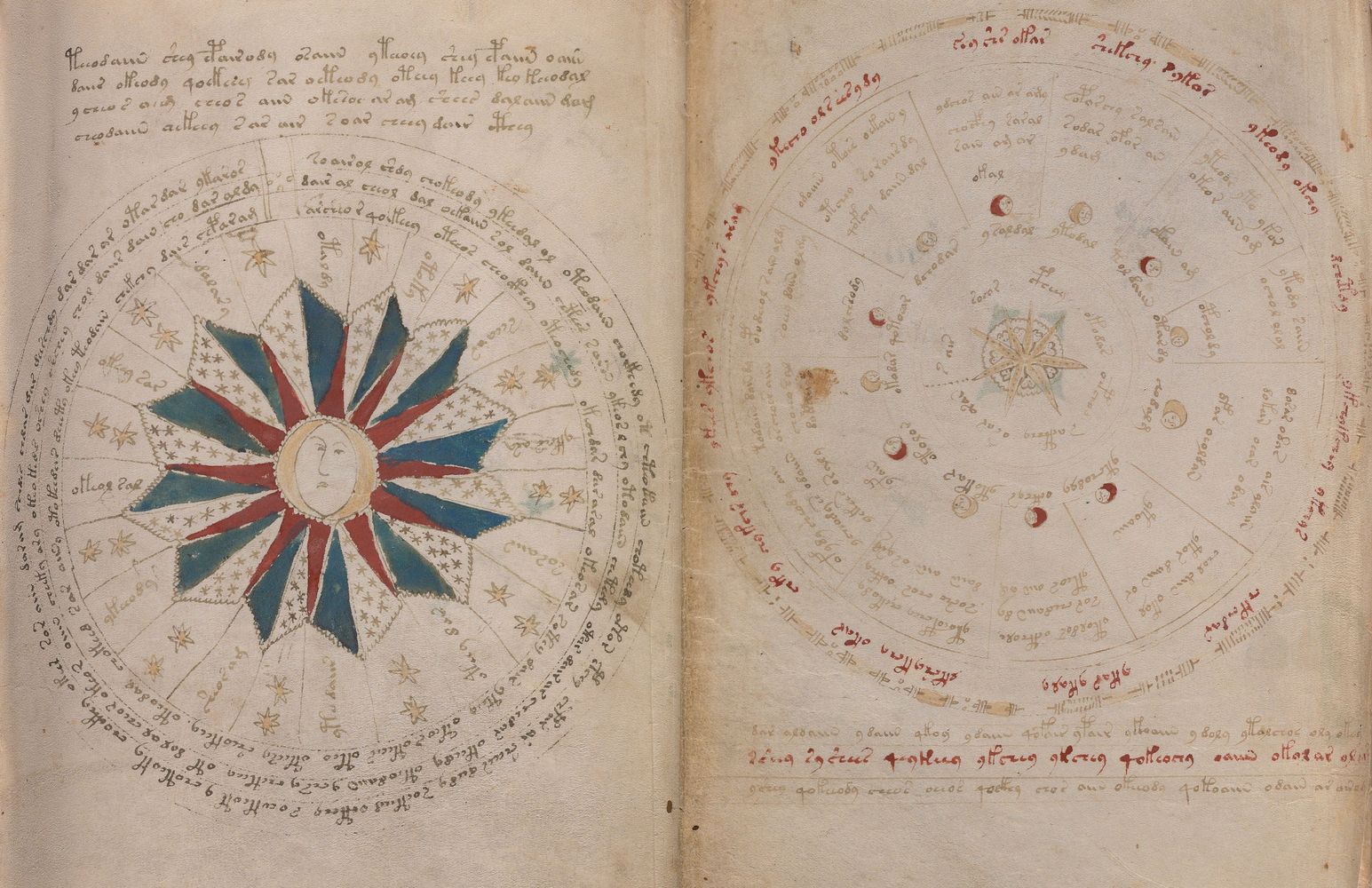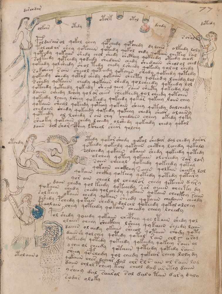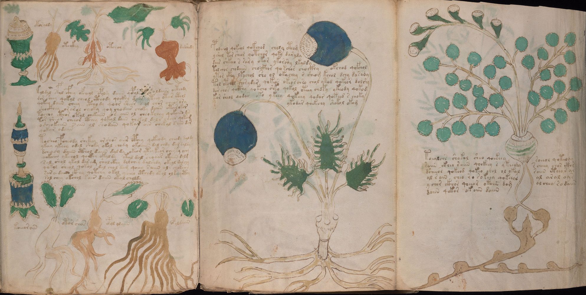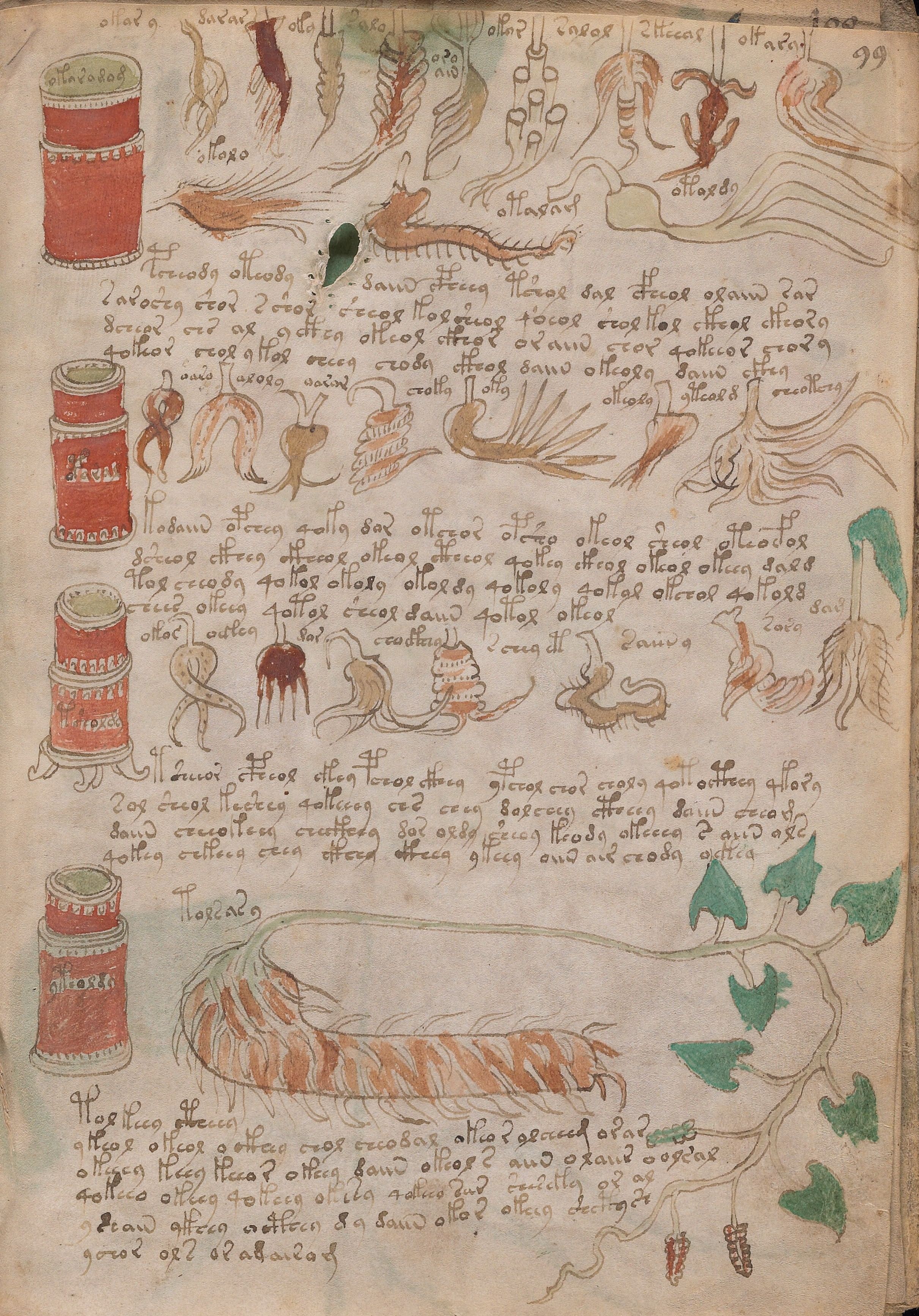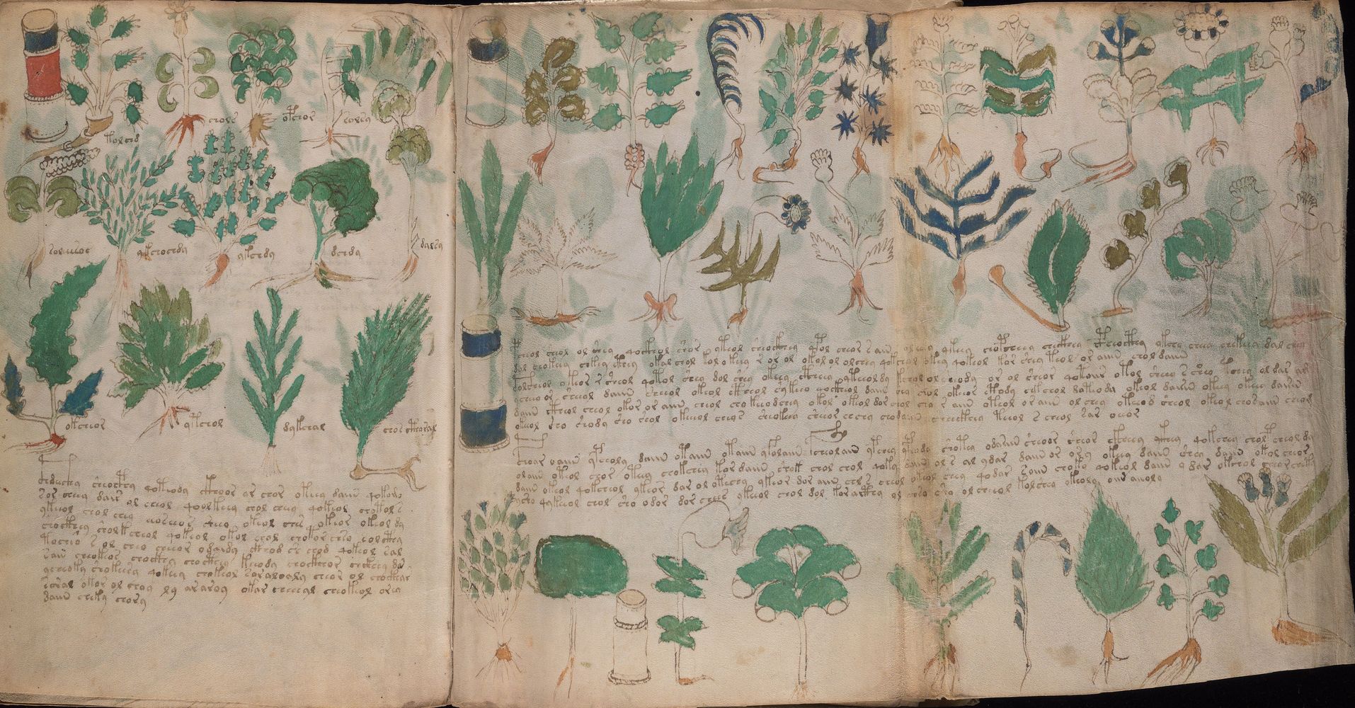 ► Le ms., qui est passé entre les mains de Dee, Rodolph II et Kircher, présente des illustrations de plantes, dont une bonne part son inconnues ainsi que des figurations astrologiques, cosmologiques et vraisemblablement alchimiques voir magiques. Certains chercheurs ont proposé que les deux derniers chapitres pourraient se référer à de la biologie ou de la balnéothérapie ainsi qu’a des recettes phytothérapiques sinon de cuisine…