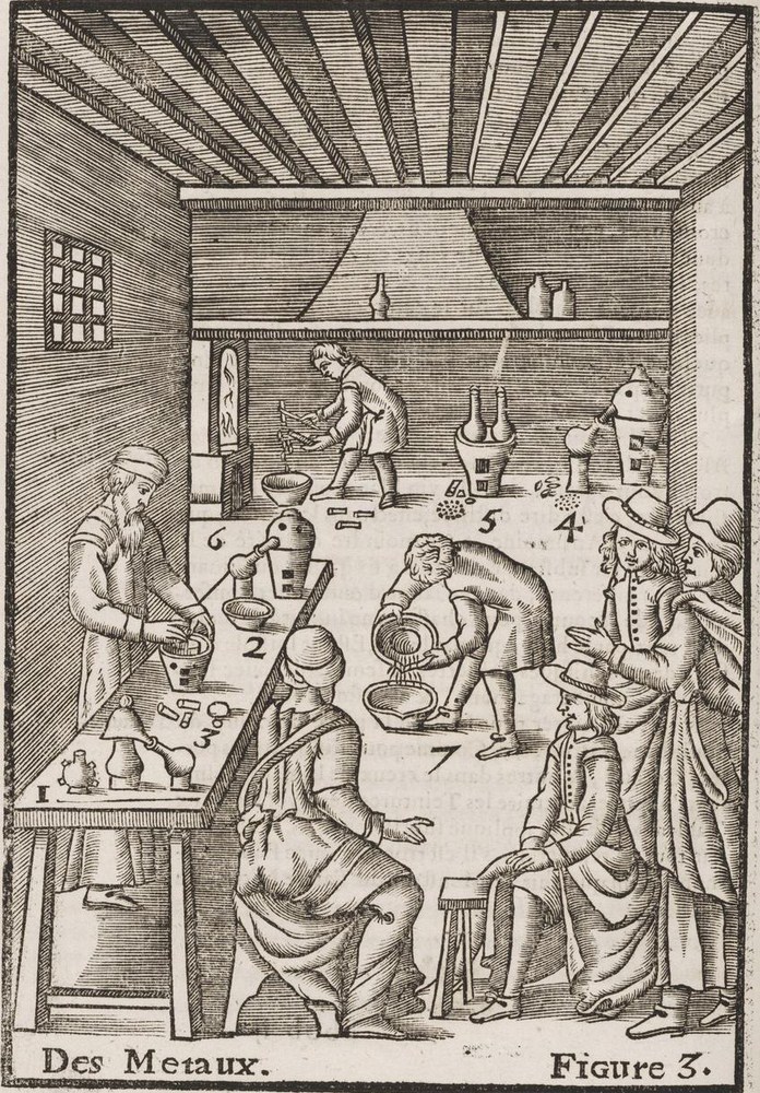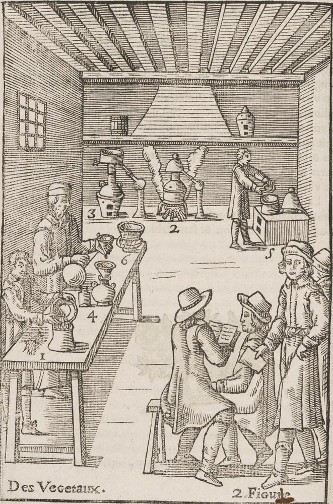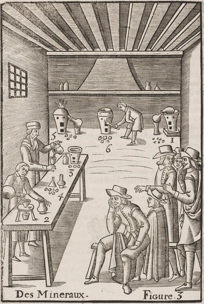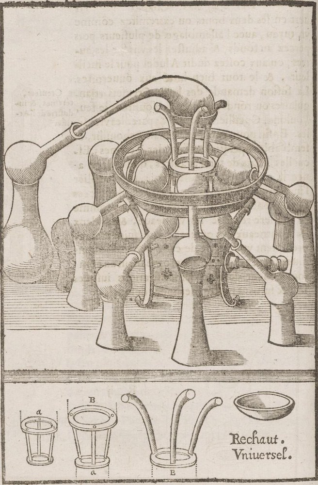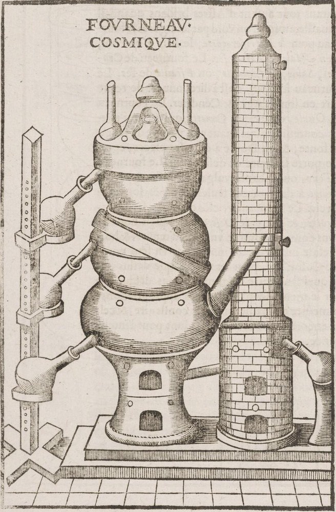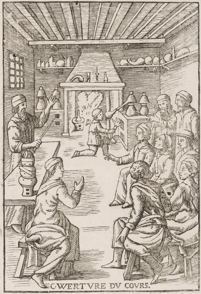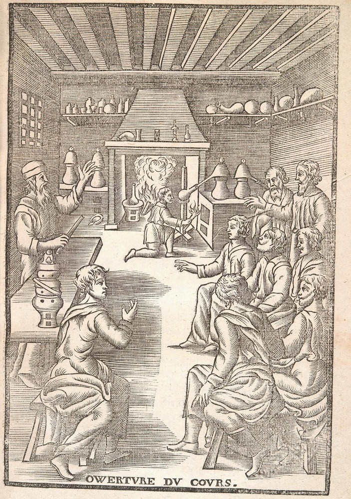 2. Avec un frontispice et de nombreuses figures sur bois du plus haut intérêt représentant les diverses opérations de la chimie (le maître entouré de ses élèves dans un grand laboratoire) les "Fourneaux" et autres instruments en usage pour cette science, des tableaux cosmiques, allégoriques des planètes, etc. En un mot, l’un des ouvrages les plus intéressants et les plus documentaires dans le genre.