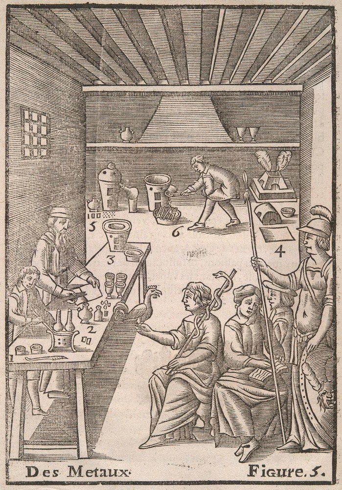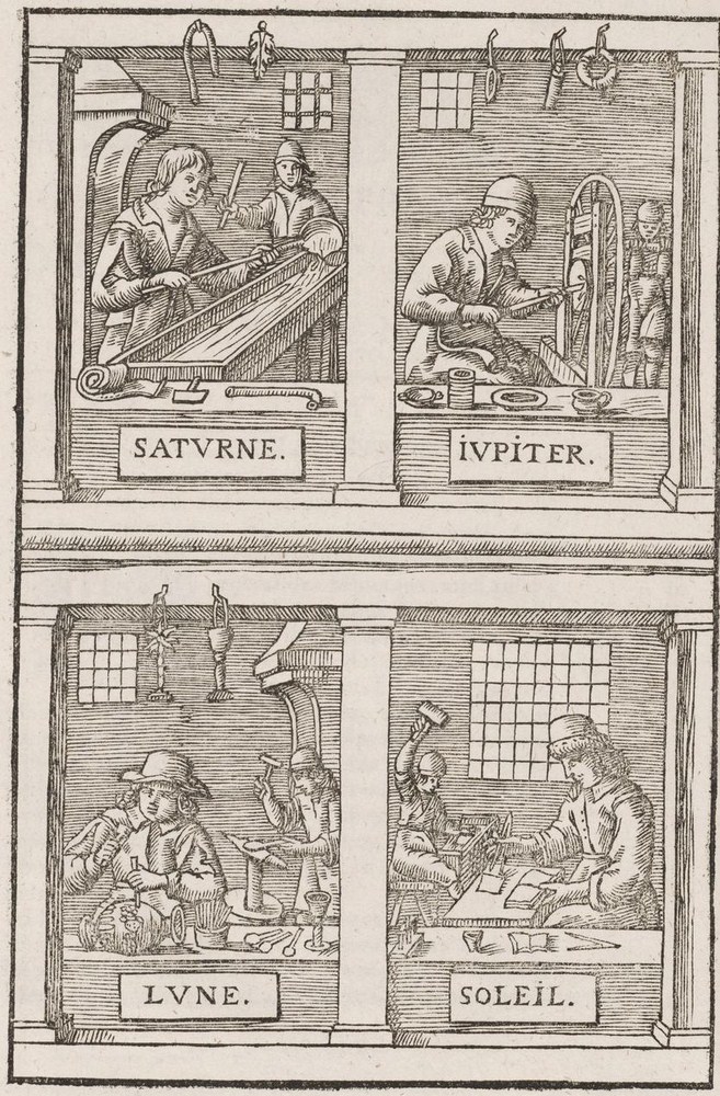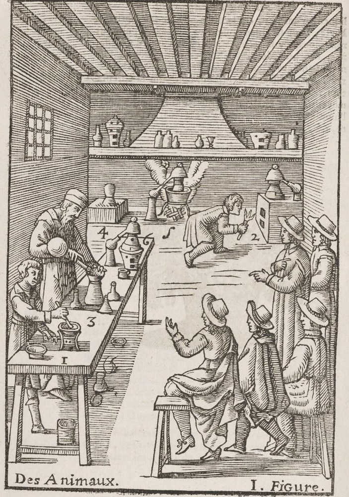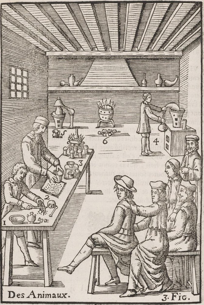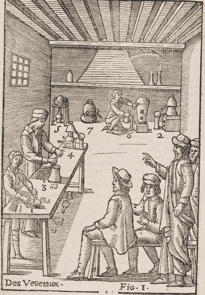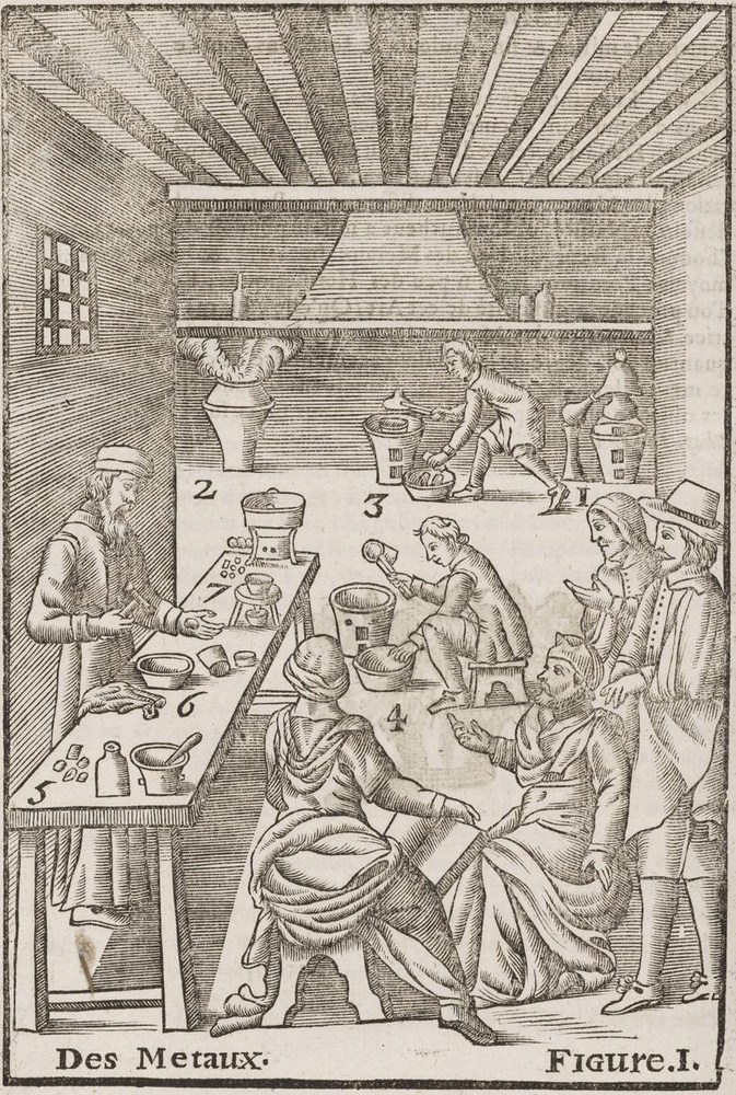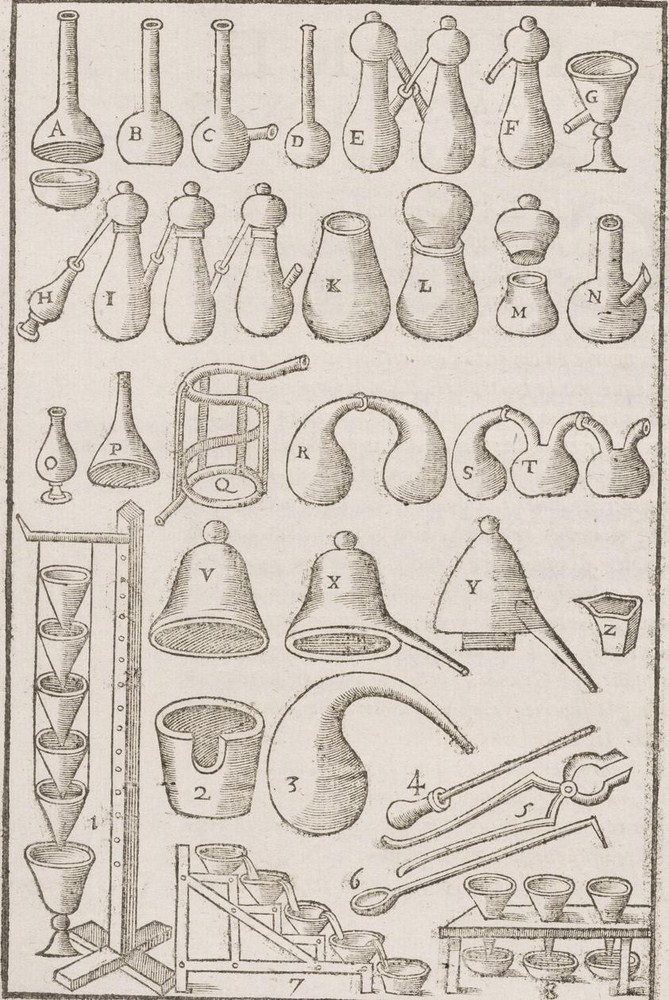 2. Avec un frontispice et de nombreuses figures sur bois du plus haut intérêt représentant les diverses opérations de la chimie (le maître entouré de ses élèves dans un grand laboratoire) les "Fourneaux" et autres instruments en usage pour cette science, des tableaux cosmiques, allégoriques des planètes, etc. En un mot, l’un des ouvrages les plus intéressants et les plus documentaires dans le genre.