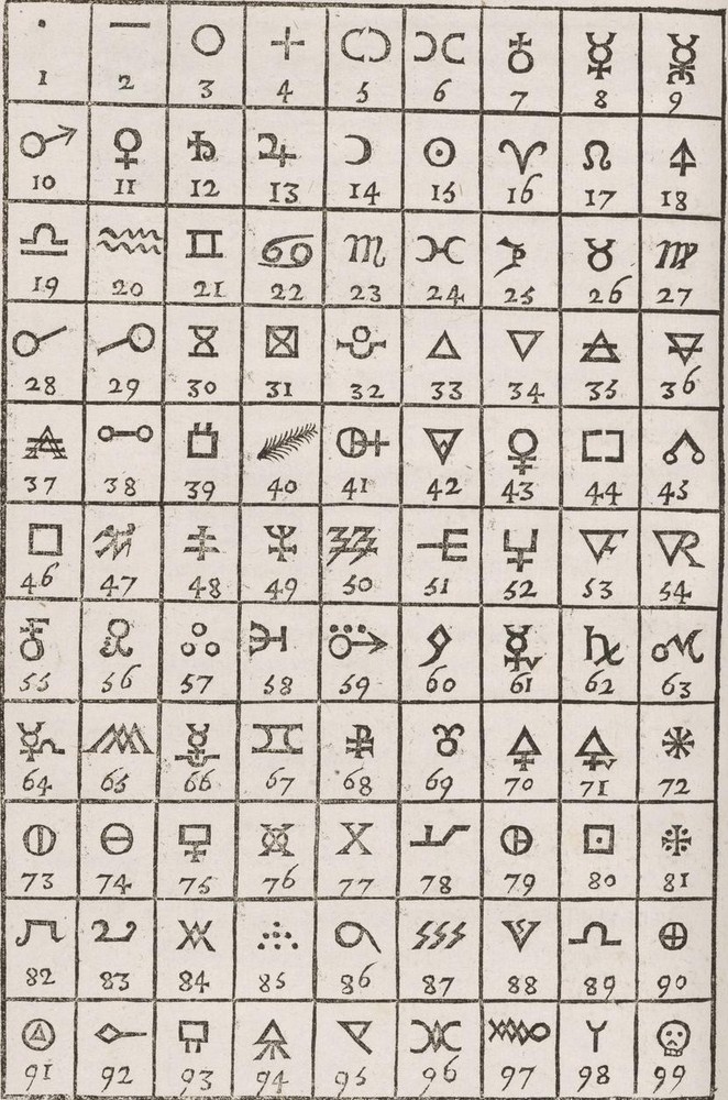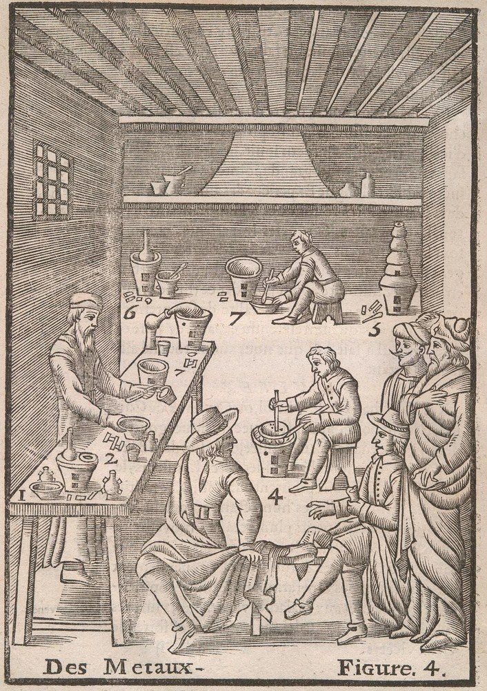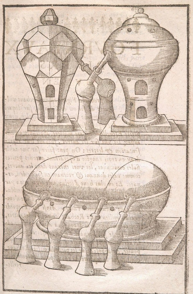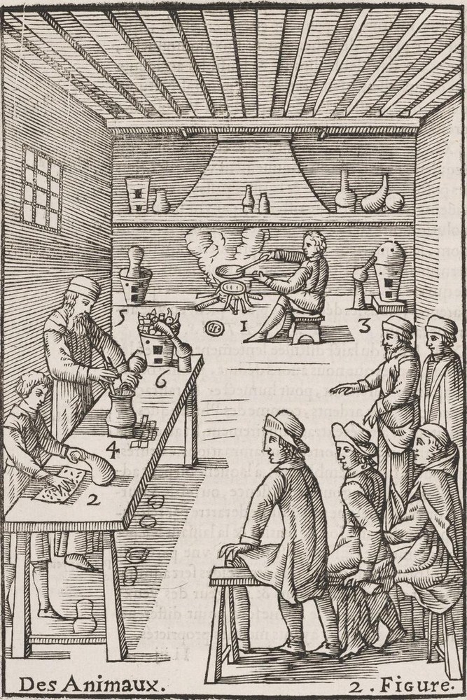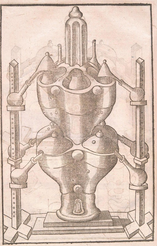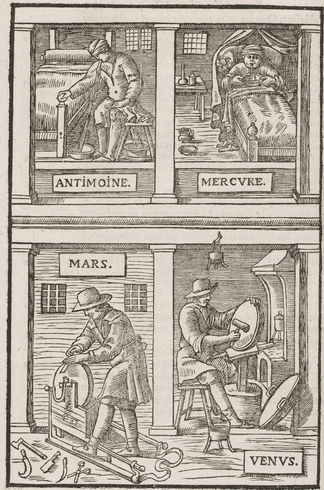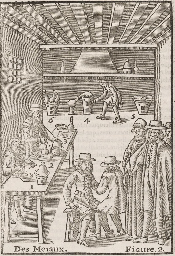 2. Avec un frontispice et de nombreuses figures sur bois du plus haut intérêt représentant les diverses opérations de la chimie (le maître entouré de ses élèves dans un grand laboratoire) les "Fourneaux" et autres instruments en usage pour cette science, des tableaux cosmiques, allégoriques des planètes, etc. En un mot, l’un des ouvrages les plus intéressants et les plus documentaires dans le genre.