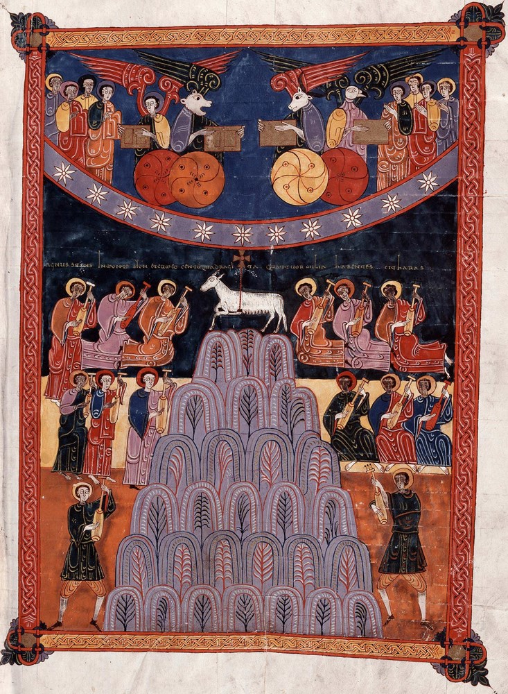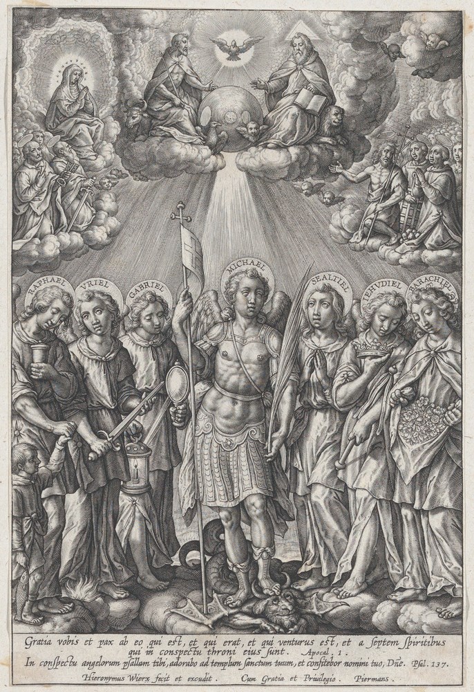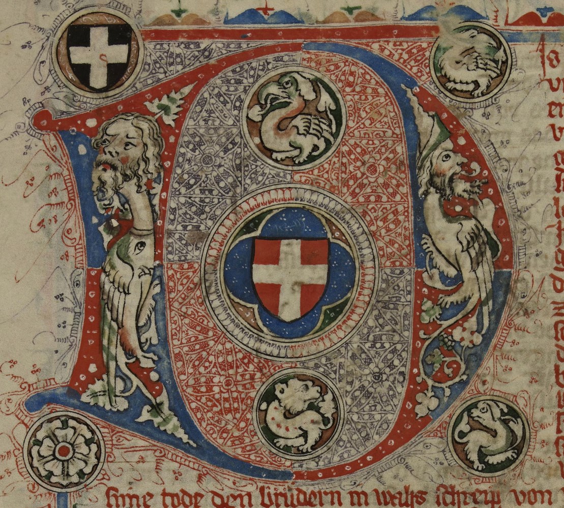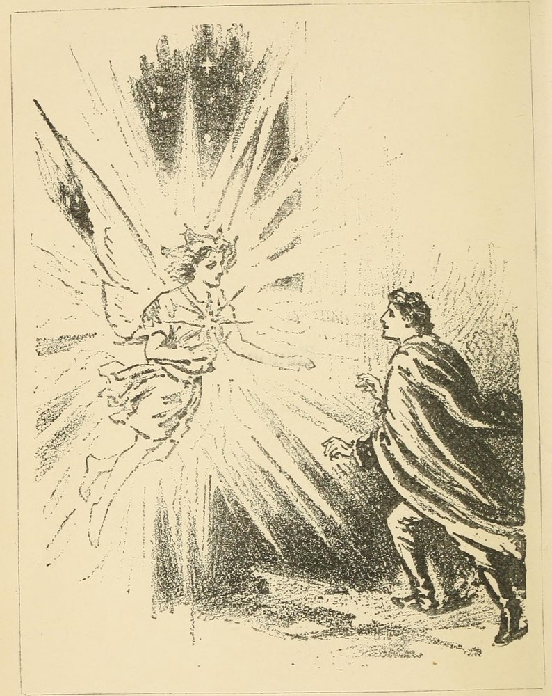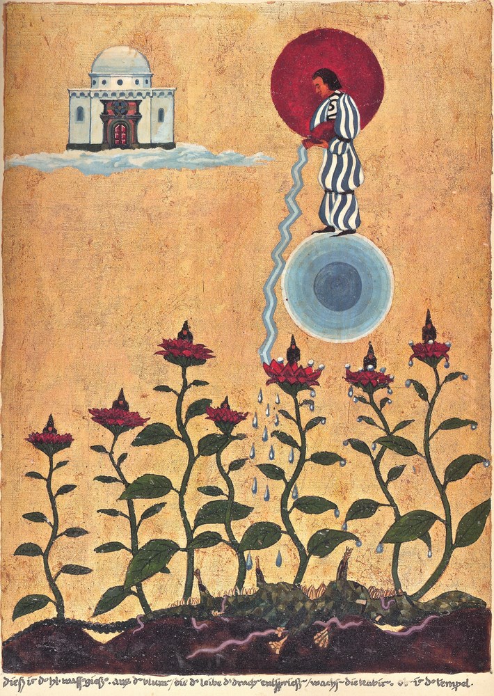 Note : Le texte indique : Voici le saint lanceur d’eau. Les Cabires murissent des fleurs qui poussent du corps du dragon. En haut, le temple.
