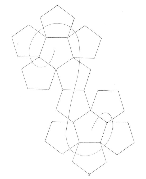 Une dernière remarque à propos des motifs symboliques : l’une des branches en S du Swastika, qui apparaît si souvent dans la décoration des objets celtiques (Jullian, p. 138, n. 5 ; 142, n. 1 ; — Hubert, XXI, p. 145 et 59) se retrouve curieusement encore dans le tracé directeur de succession des pentagones à partir de l’une des faces, et disposés, comme le montre notre figure 2, en deux grandes fleurs pentagonales.